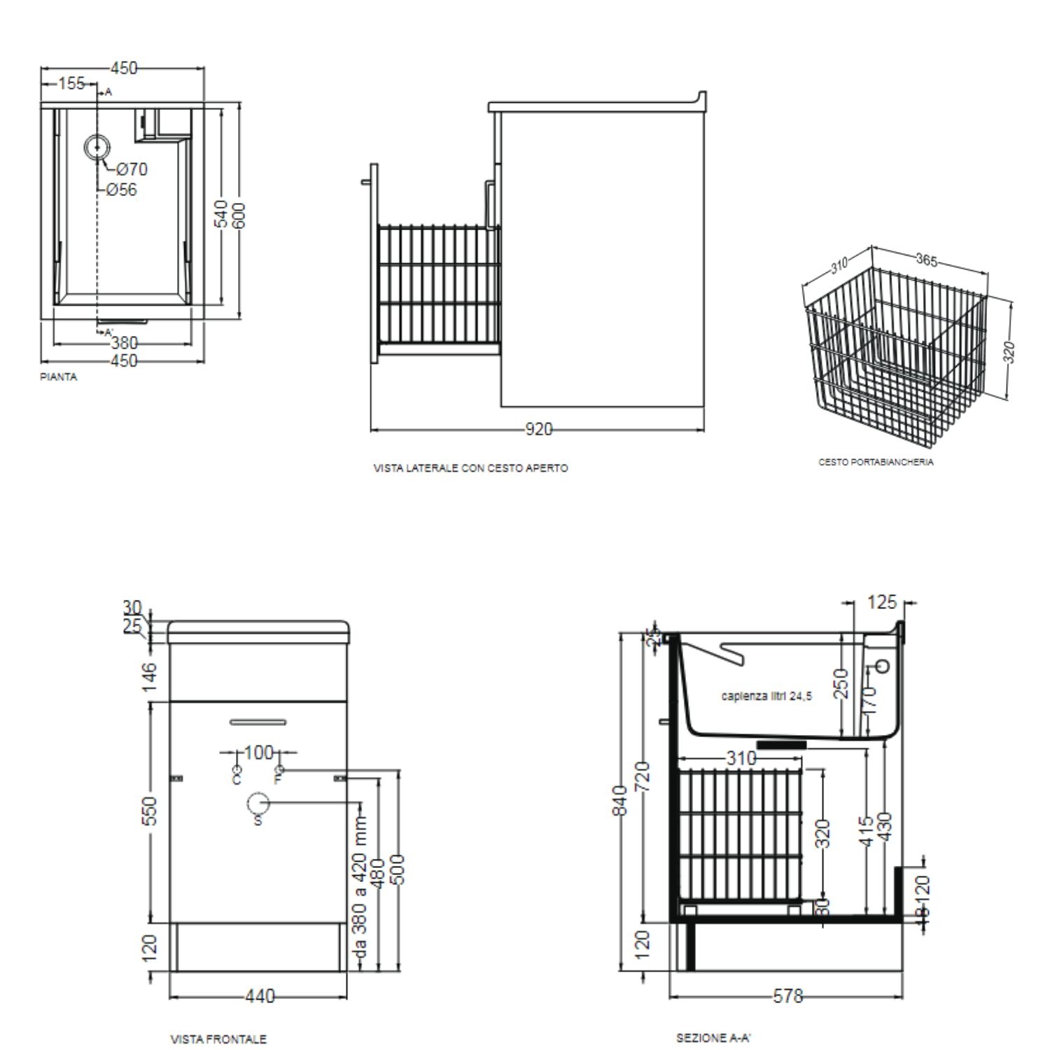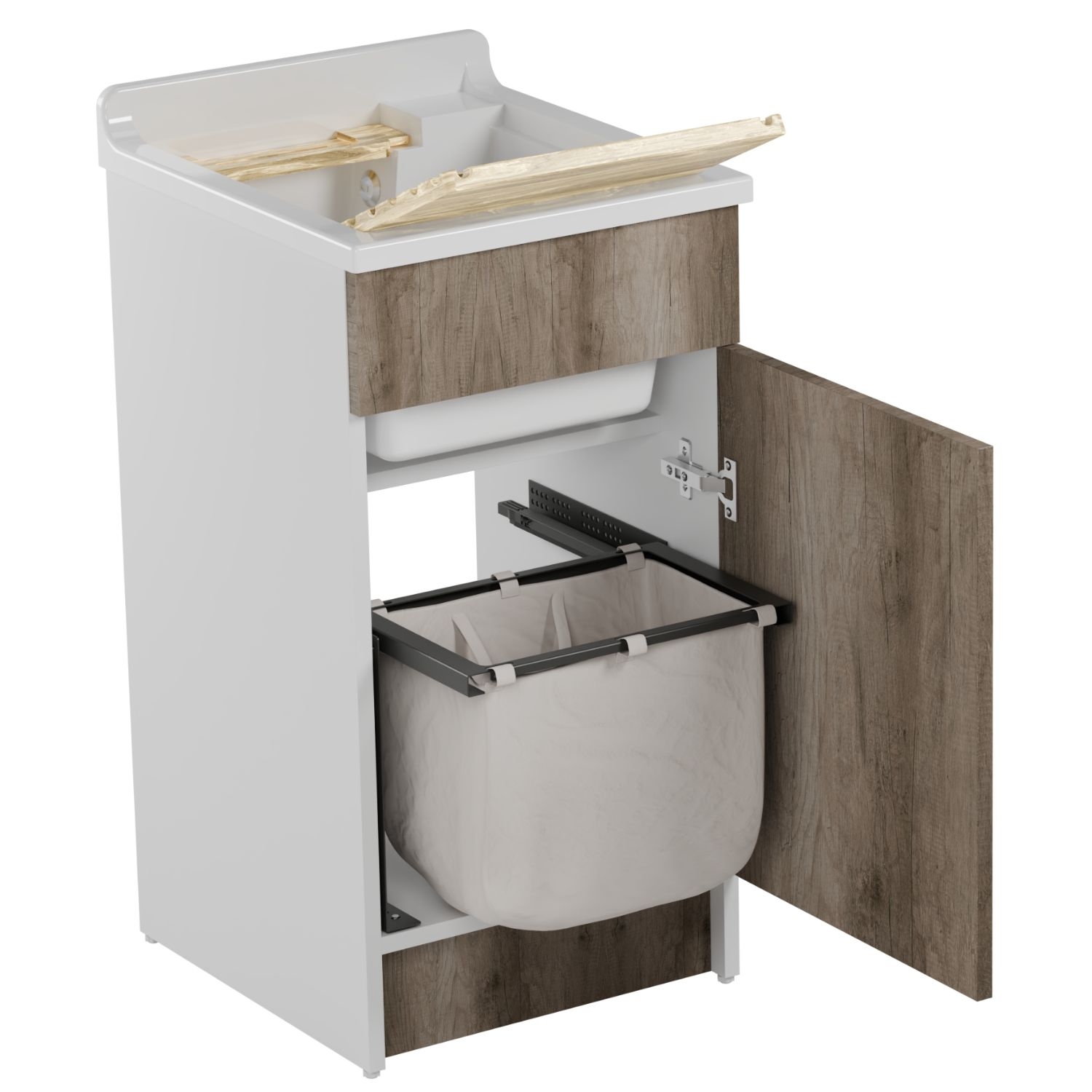 - Completo di: cesto portabiancheria (scorrevole ed estraibile), asse lavapanni in legno massello, sifone e troppopieno