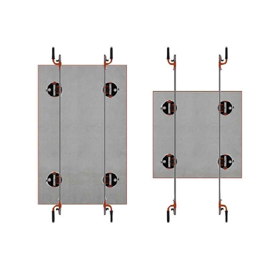 Paire de dispositifs pour la manutention de carreaux/dalles de longueur jusqu’à 150 cm. Traverses non incluses. Profilés en aluminium de longueur fixe, équipés de 4 ventouses (2 pour chaque profilé) à vide RV175 idéales aussi pour les matériaux structurés.Ventouses équipées de vide-cylindre et rabat en caoutchouc résistant aux taches, les deux facilement remplaçables.