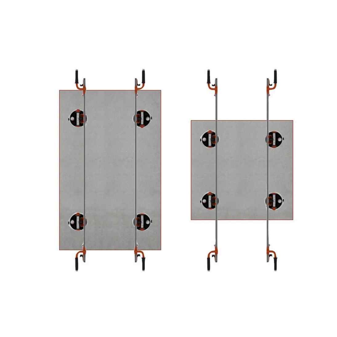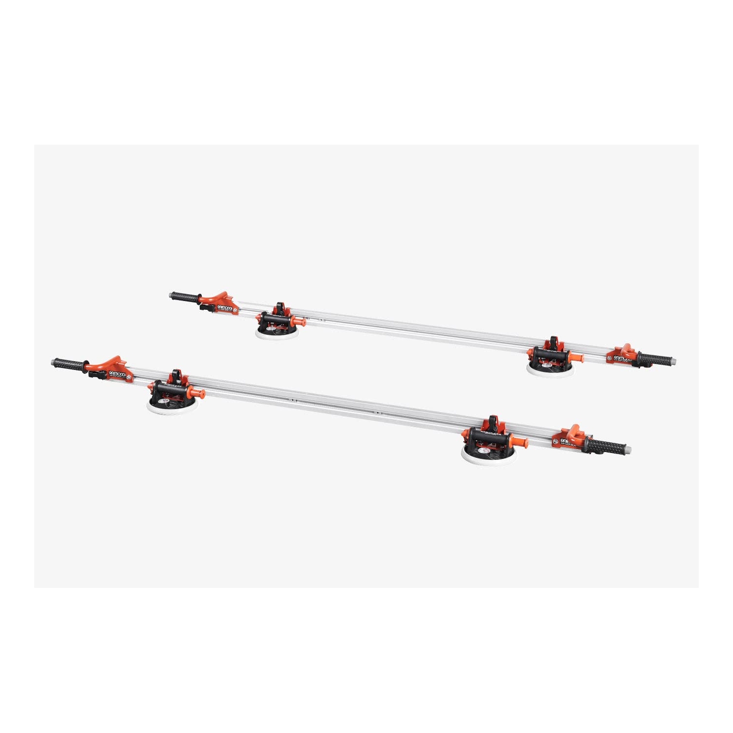 Coppia di dispositivi per la movimentazione di piastrelle/lastre di lunghezza fino a 150 cm. Traverse non incluse. Profili in alluminio di lunghezza fissa, equipaggiato con 4 ventose (2 per ogni profilo) vacuum RV175 ideali anche per materiali strutturati. Ventose dotate di vuotometro e patta in gomma antimacchia, entrambi facilmente sostituibili.