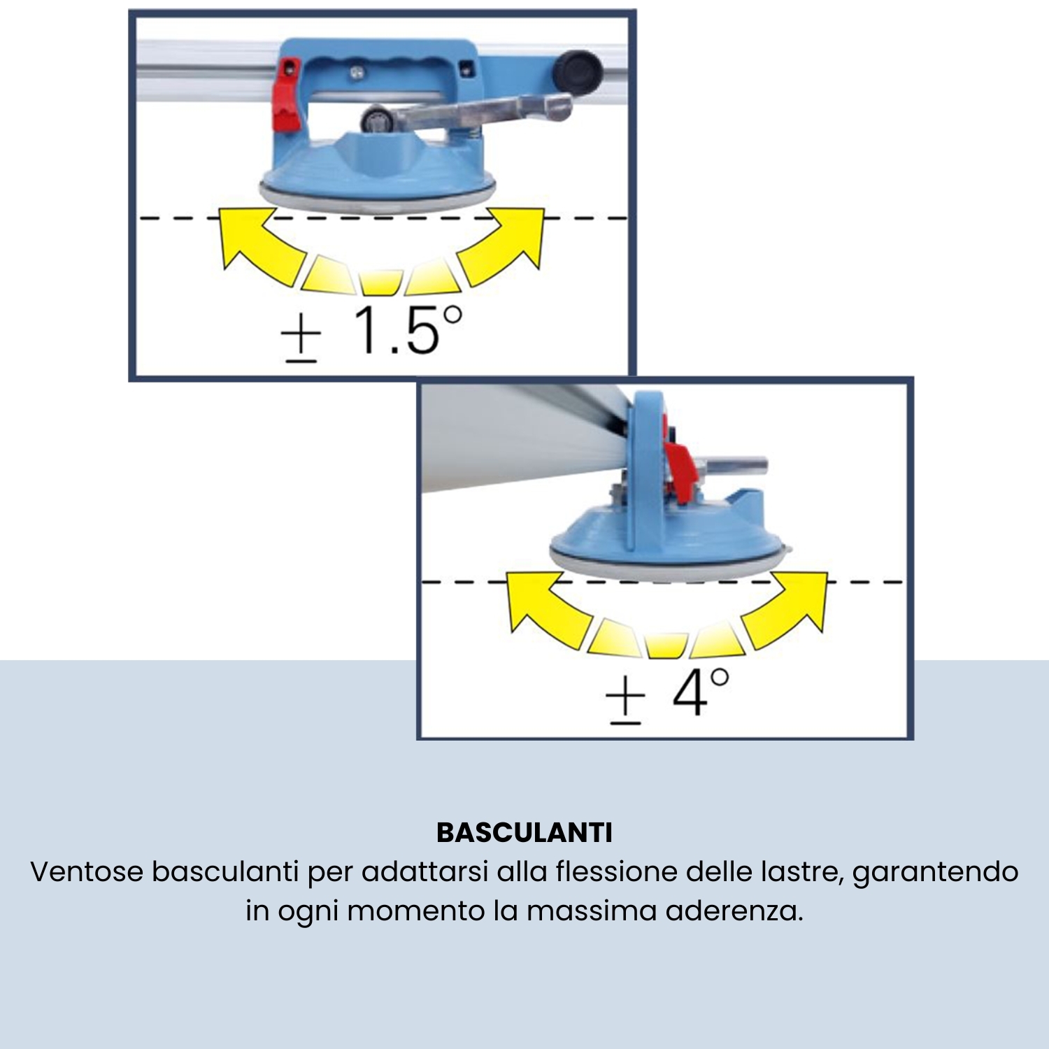 KERA-LIFT” attrezzatura con ventose per il sollevamento, la movimentazione e la posa di grandi piastrelle, liberamente adattabile alla forma della piastrella senza l’uso senza l’uso di utensili, è composta da guide scorrevoli fra loro per adattarsi a qualsiasi forma della lastra, equipaggiata con ventose Pro-Grip. La nuova ventosa ad azionamento rapido perfetta anche per materiali strutturati, dotata di vuotometro e gomma antimacchia facilmente sostituibile. Le ventose possono scorrere lungo il profilo per adattarsi a qualsiasi esigenza. Tutti i modelli sono certificati CE