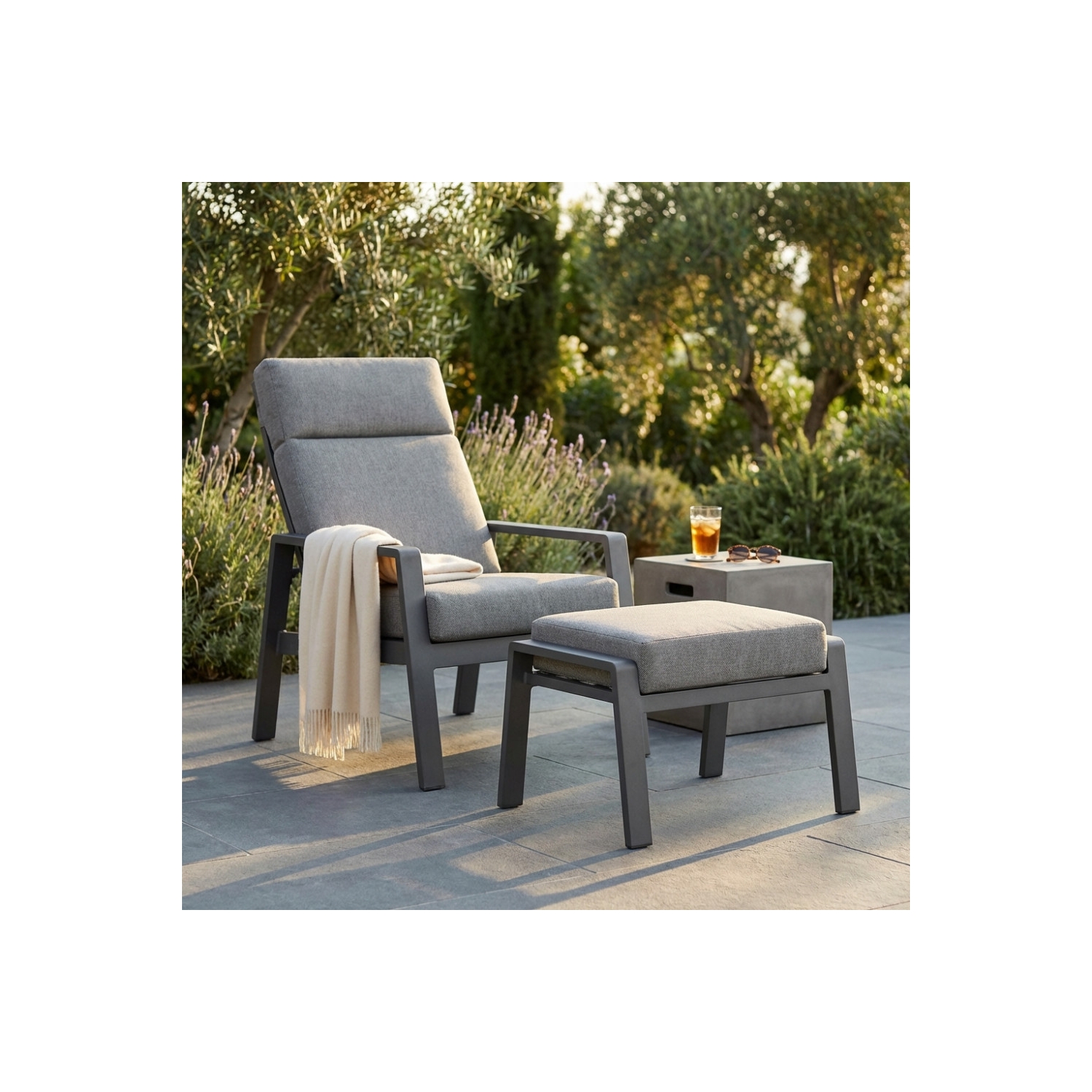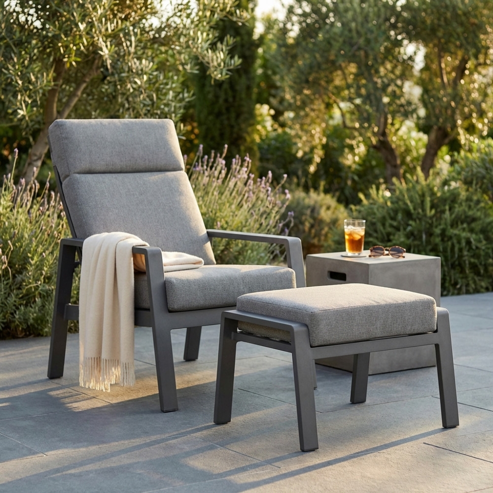 Poggiapiedi in alluminio verniciato ANTRACITE con cuscino. Dimensioni: 65x56x41h cm. Poltrona venduta separatamente.
