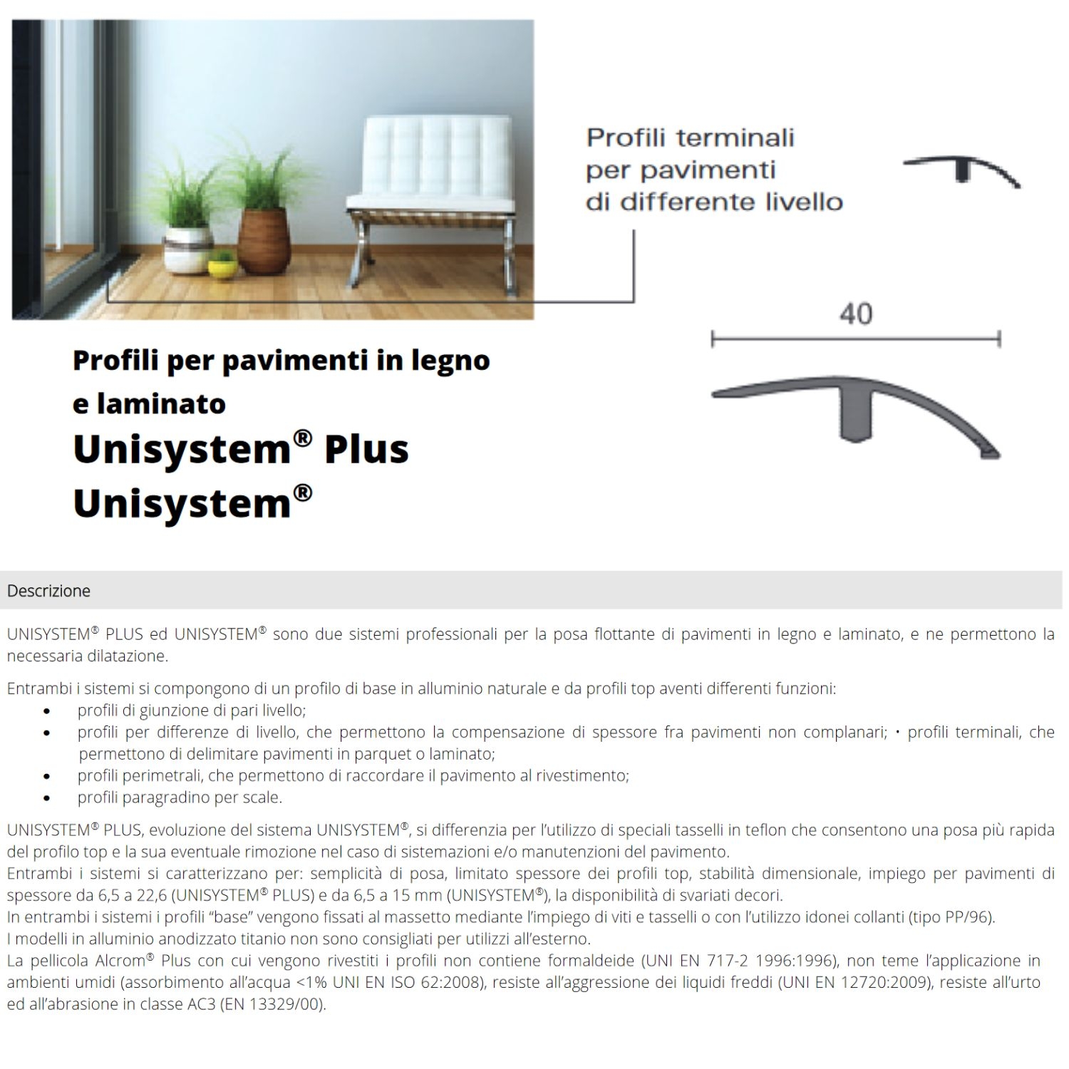 UNISYSTEM® PLUS è un sistema professionali per la posa flottante di pavimenti in legno e laminato, e ne permettono la necessaria dilatazione. Il sistema si compone di un profilo di base in alluminio naturale e da profili top aventi differenti funzioni.