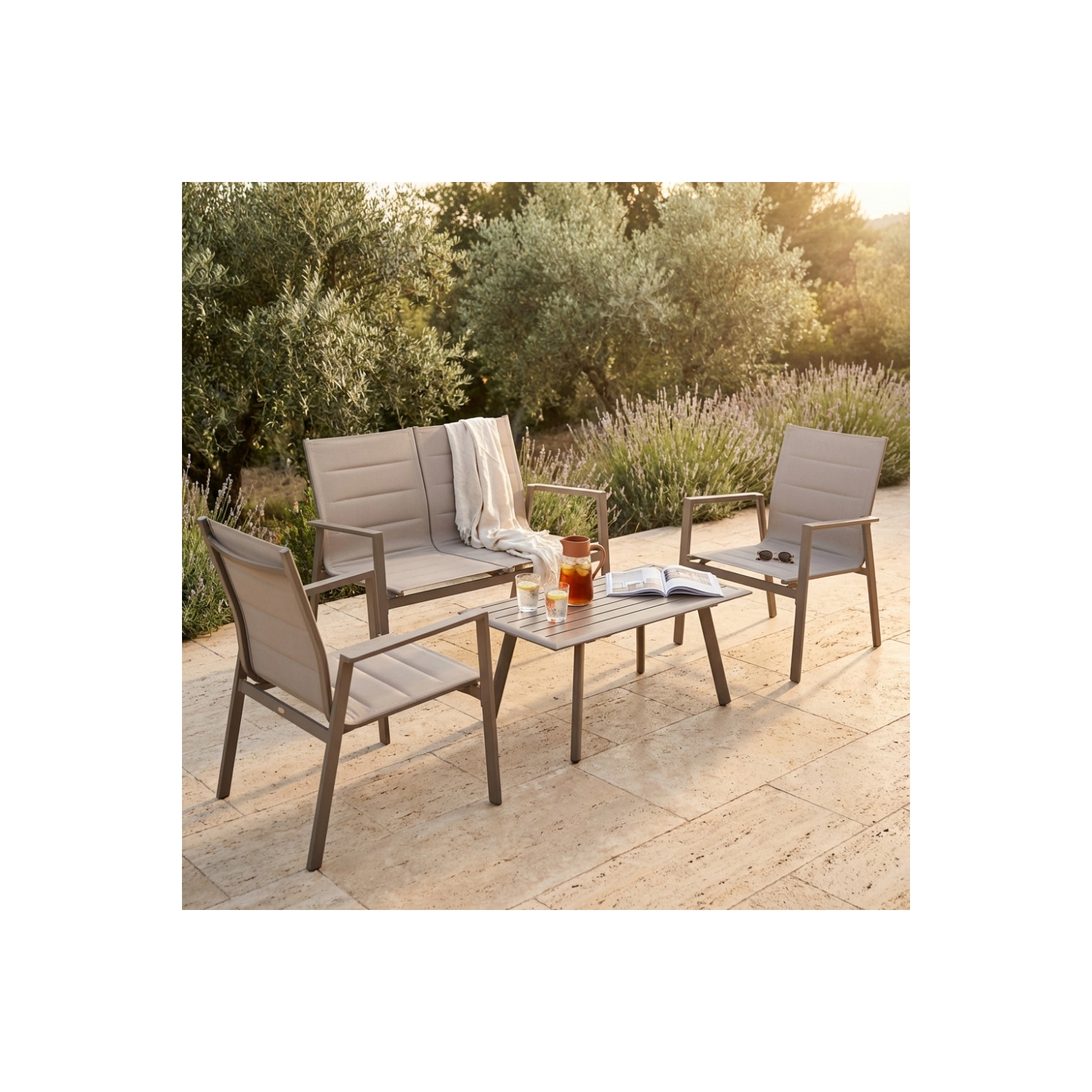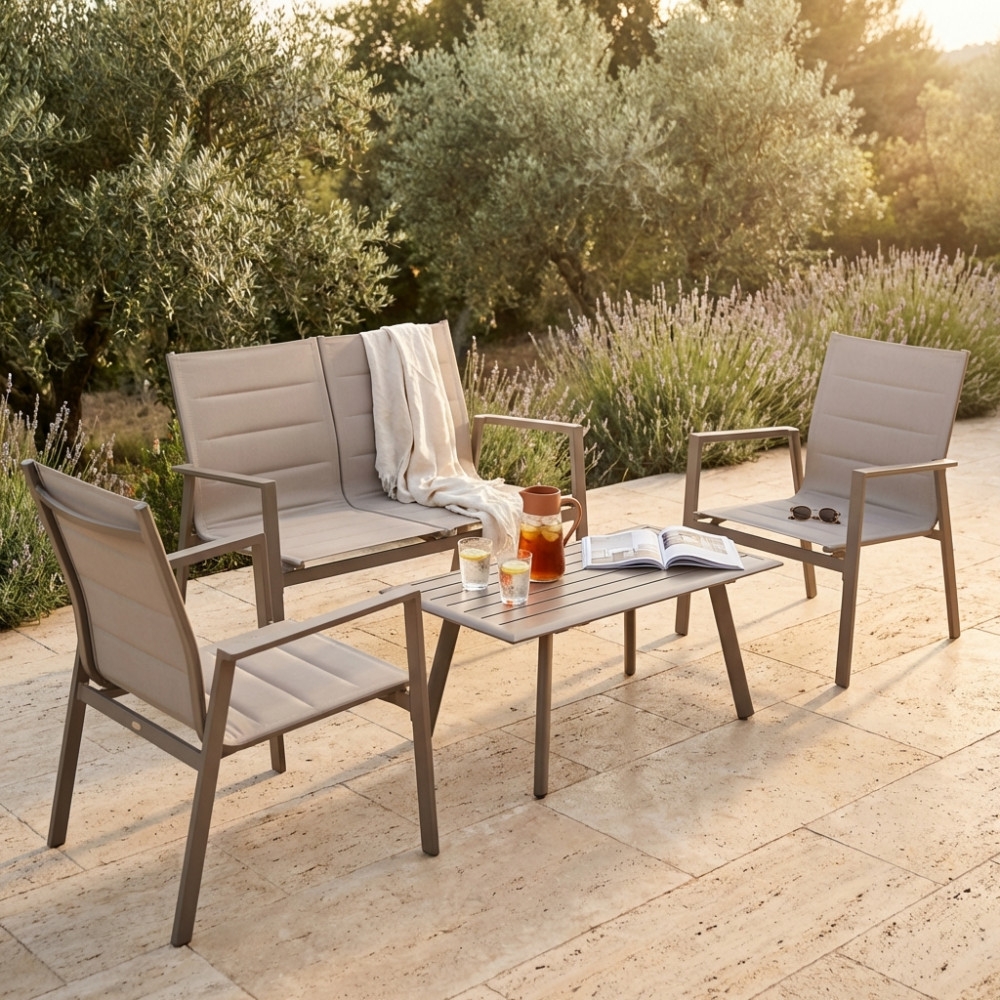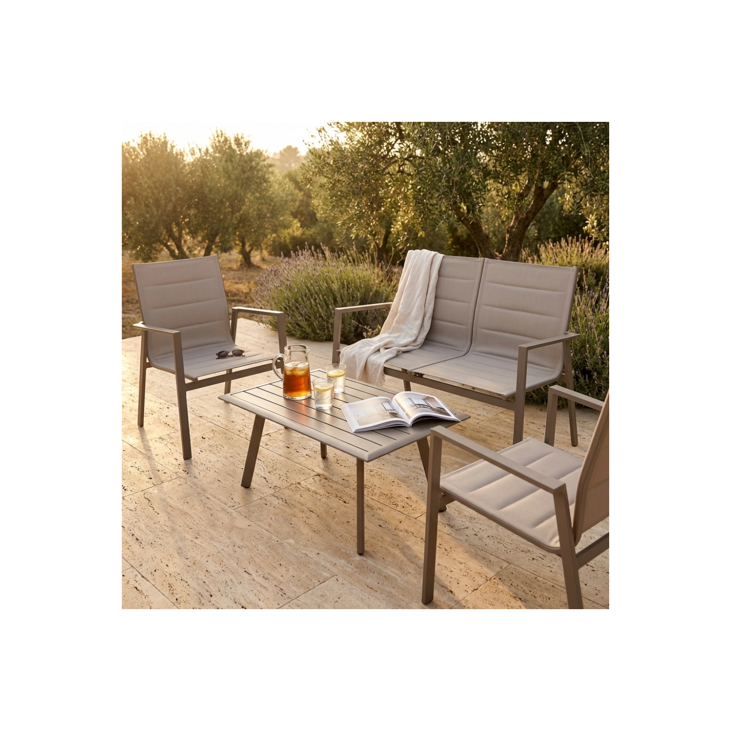 Struttura in alluminio BIANCO, TAUPE o ANTRACITE textilene imbottito GRIGIO CHIARO, TAUPE o ANTRACITE Dimensioni: D.124x71x87/P.69x71x87/T.100x55x42
