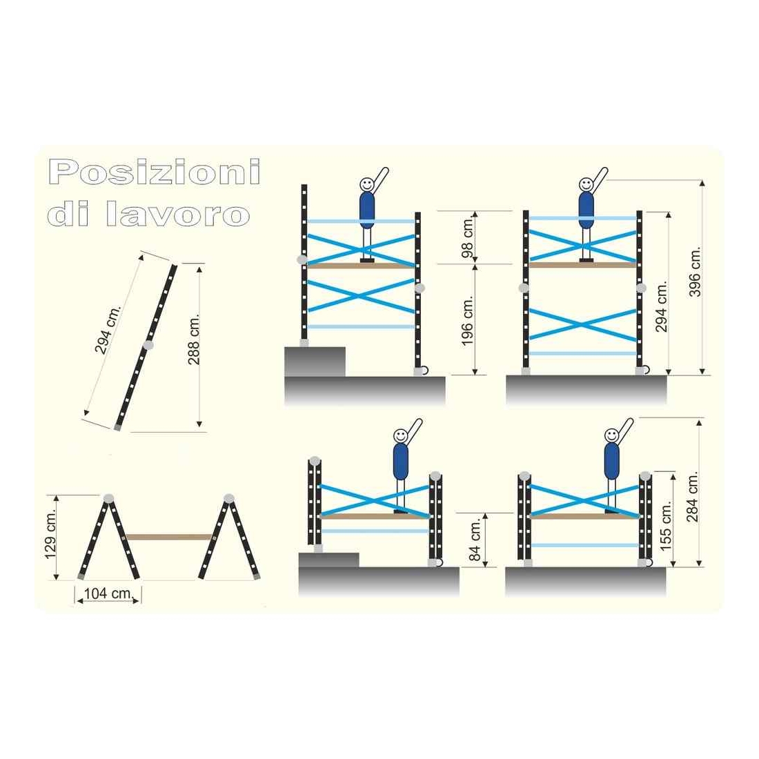 Grande funzionalità e versatilità grazie alle diverse posizioni di lavoro che consentono di utilizzare il ponteggio su dislivelli e in affiancamento a parete.