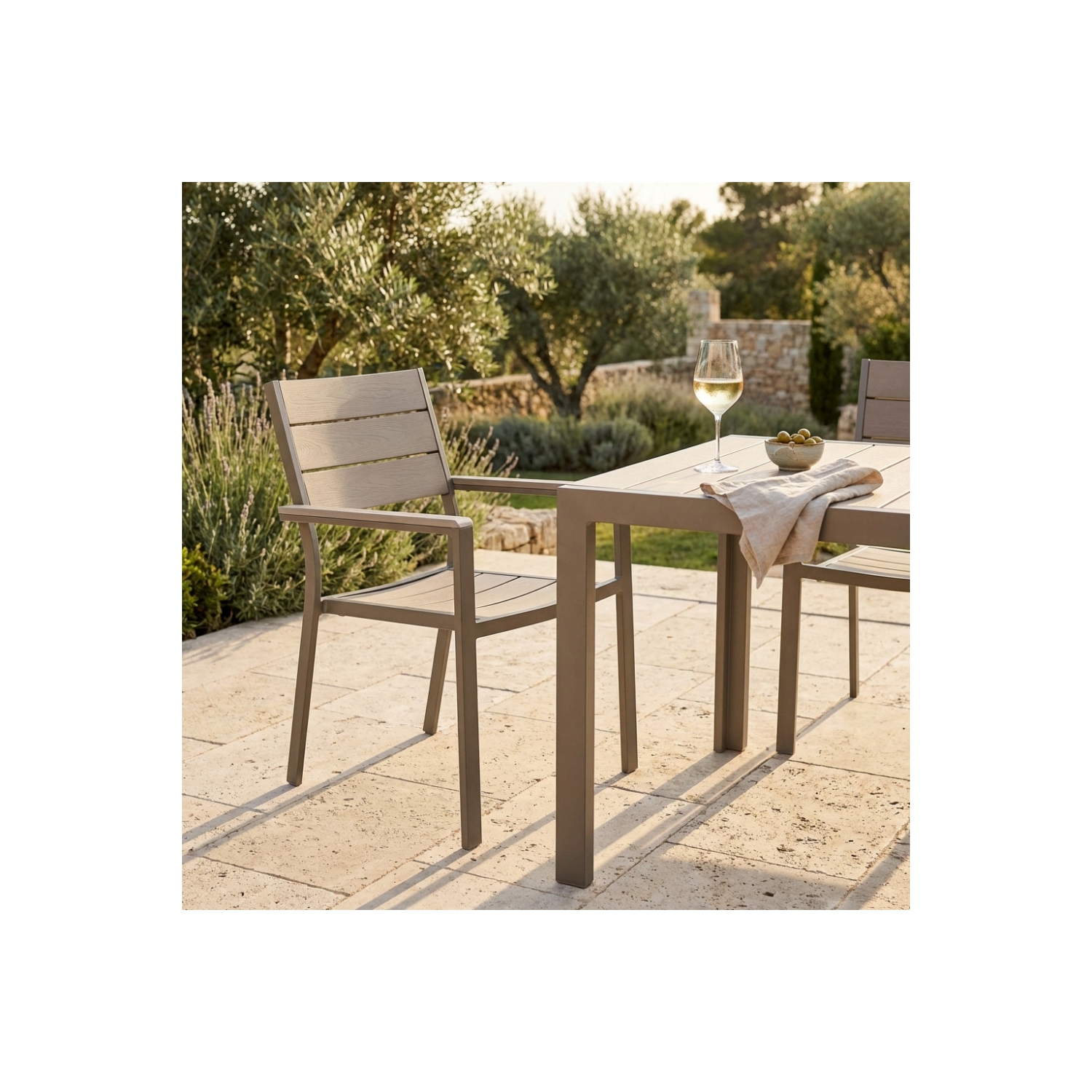 Sedia da giardino con struttura in alluminio verniciato, schienale e seduta con doghe in POLYWOOD colore grigio. Dimensioni: 58x58x89 h cm. Colore: Taupe