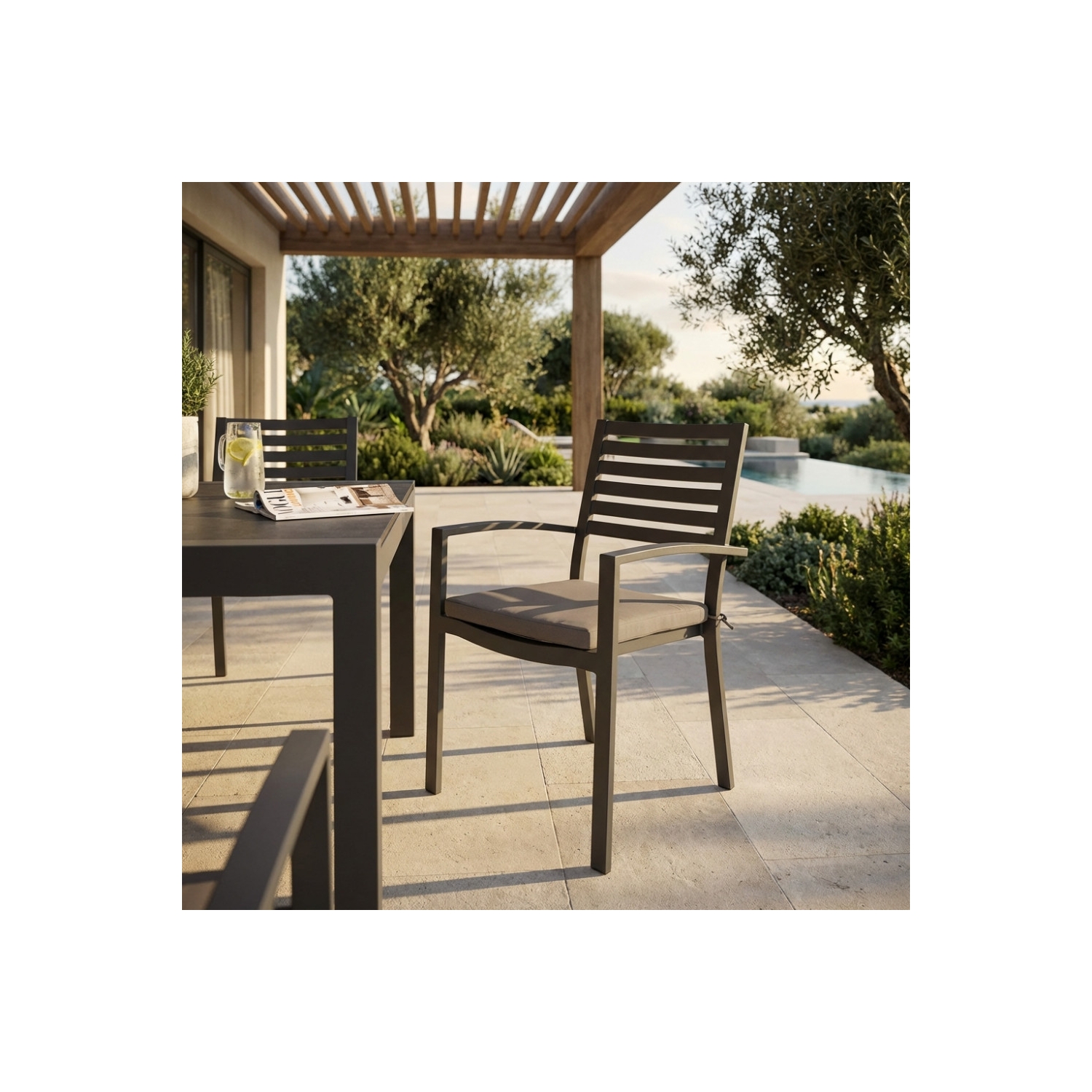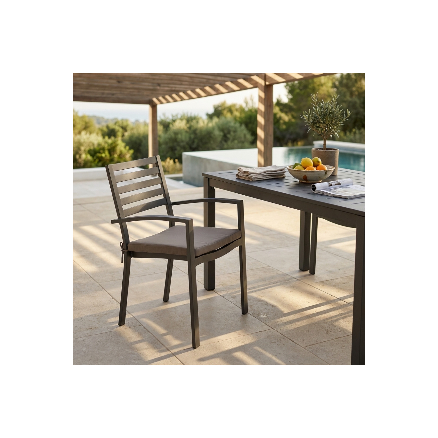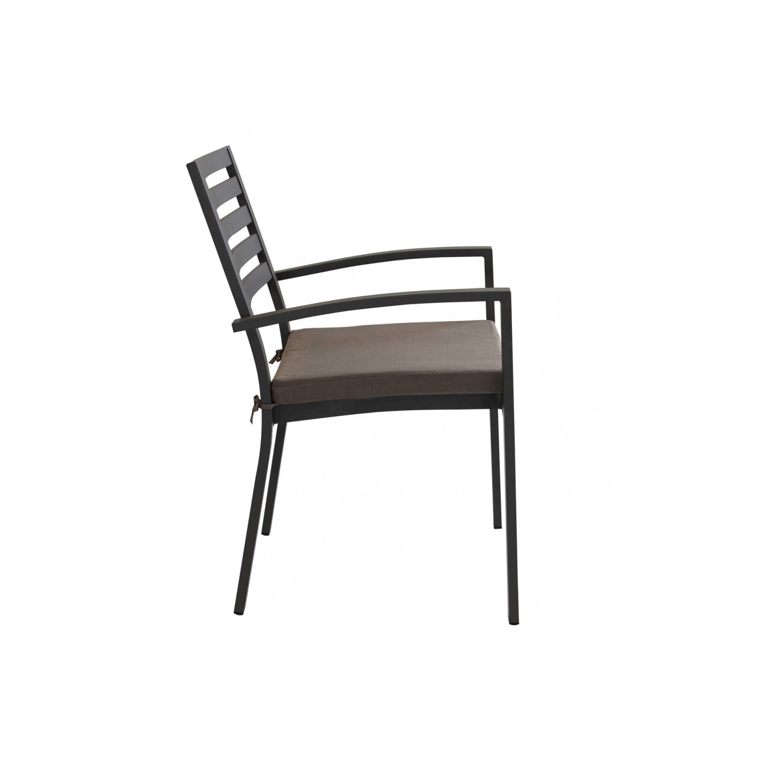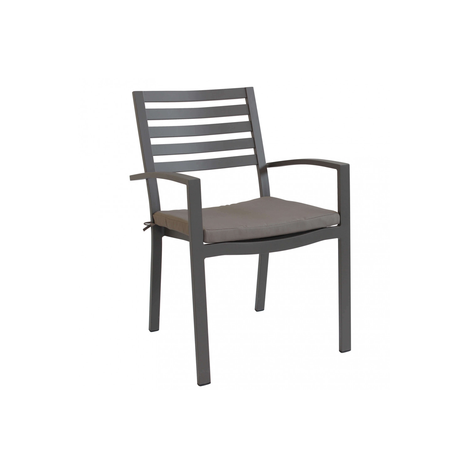 Struttura e seduta in alluminio TAUPE con cuscino TAUPE. Dimensioni: cm 46 x 62 x 84 h