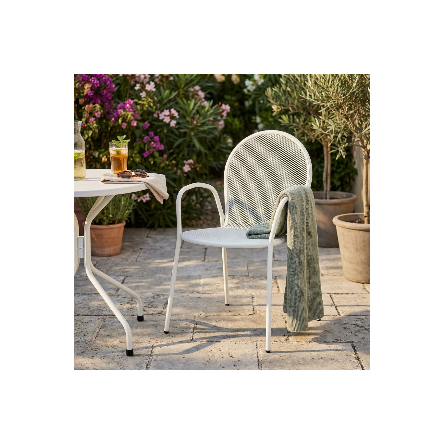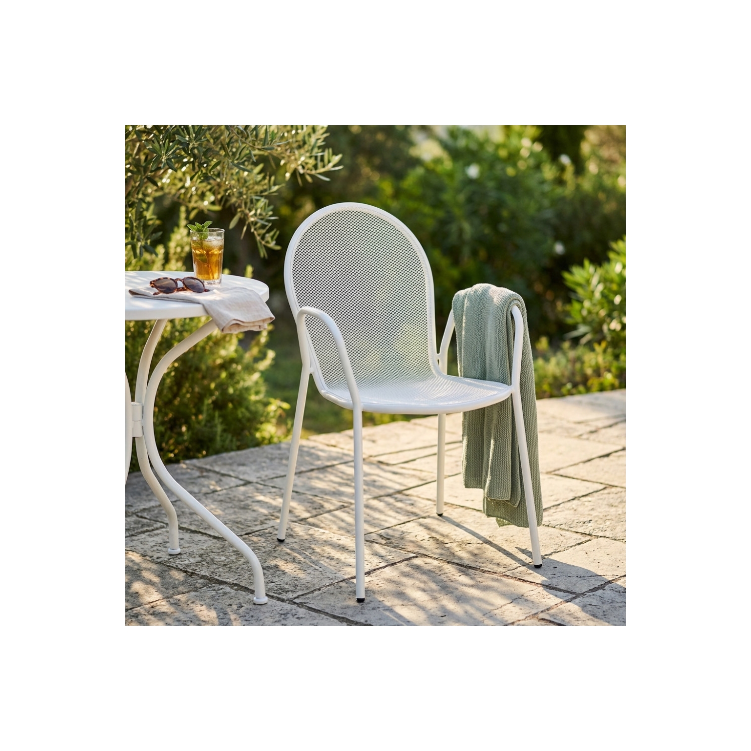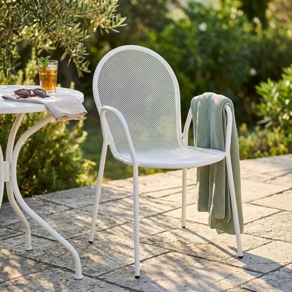 Sedia da giardino in metallo impilabile con tubi Ø 19 x 1.2 mm. Verniciatura a polvere. Dimensioni: 54x61x90 h cm. Colore: bianca