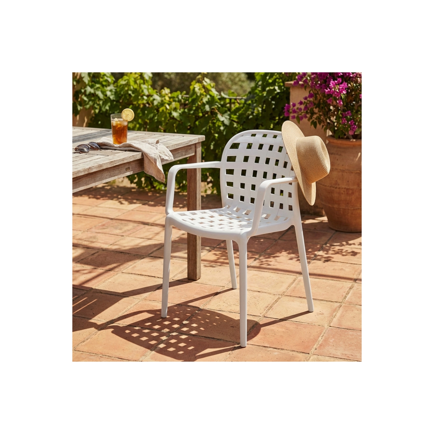 Sedia impilabile con braccioli in polipropilene bianca. Dimensioni: cm 58 x 57,5 x 82,5 h
