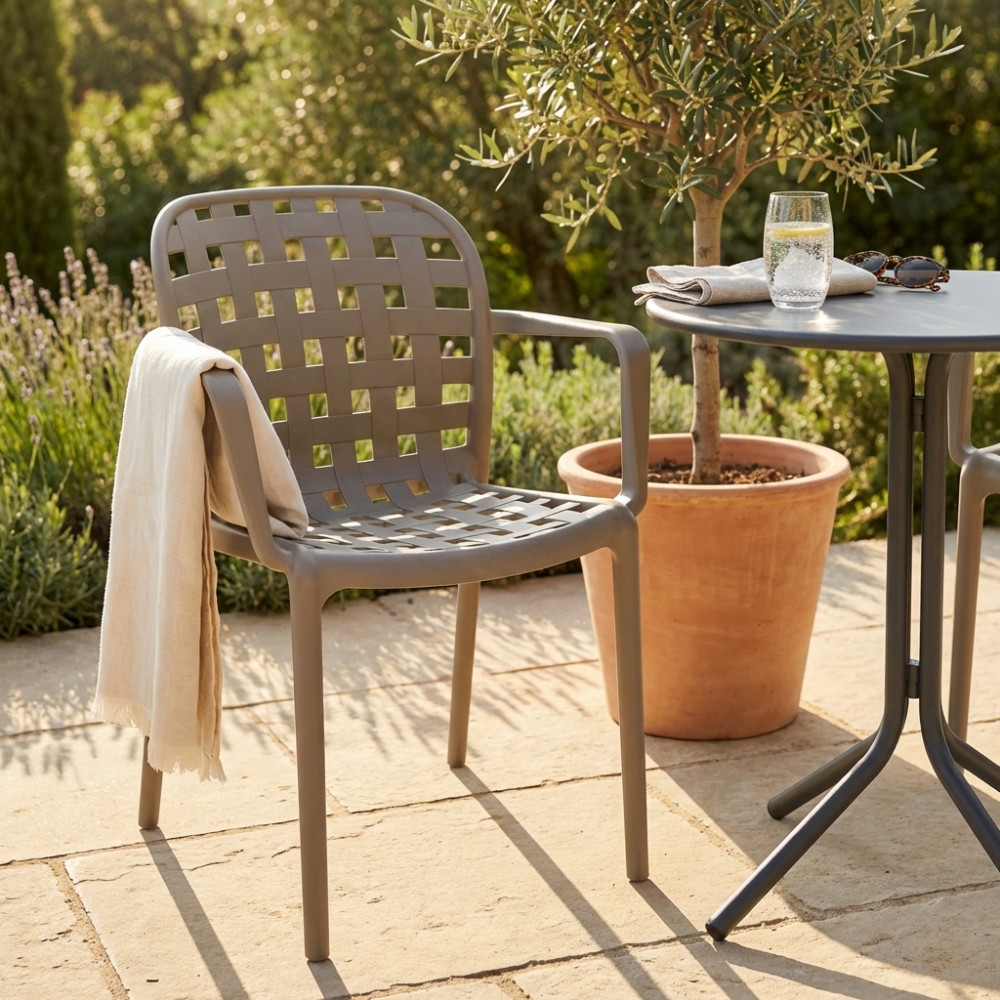 Sedia impilabile con braccioli in polipropilene grigio chiaro. Dimensioni: cm 58 x 57,5 x 82,5 h