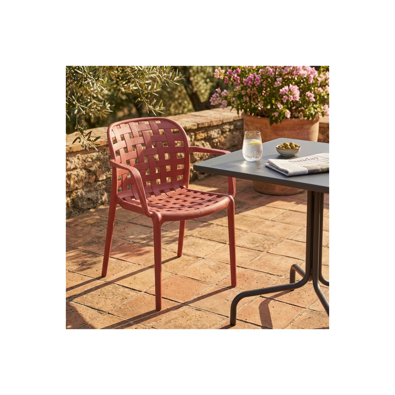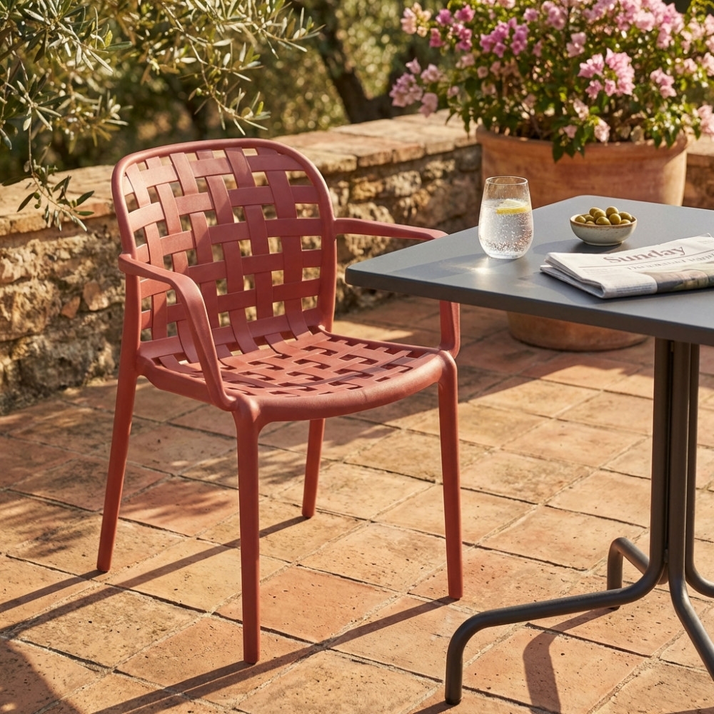 Sedia impilabile con braccioli in polipropilene rossa. Dimensioni: cm 58 x 57,5 x 82,5 h
