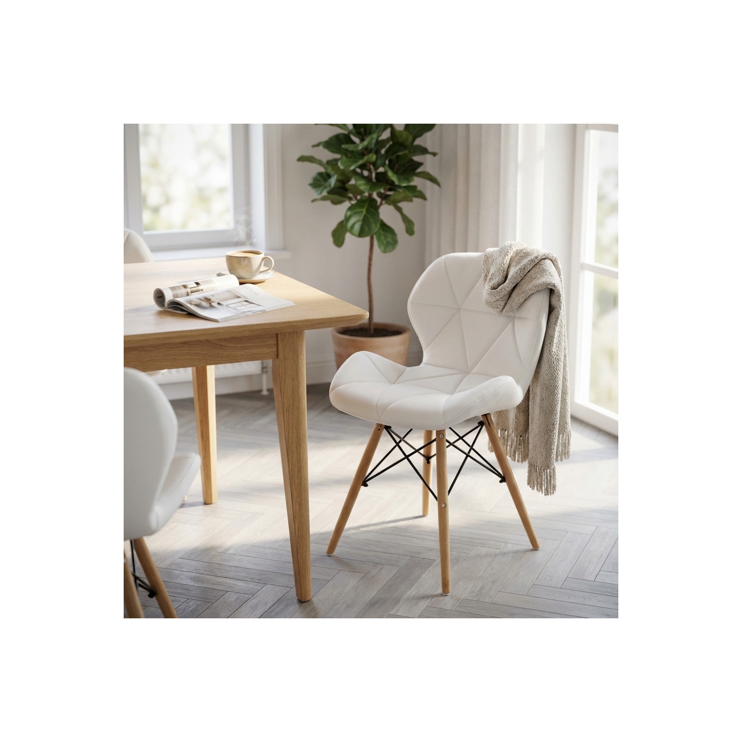 Sedia moderna bianca in ecopelle con gambe in legno, struttura in metallo, seduta in PU. Dimensioni: cm 49 l x 41 p x 71 h