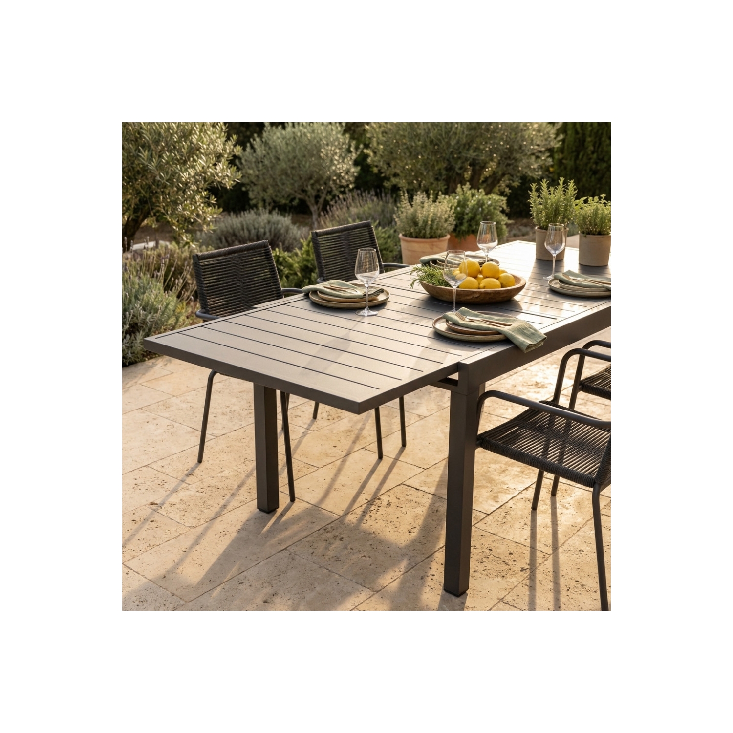Struttura e piano in allumino TAUPE. Dimensioni: cm 90/180 x 90 x 75 h