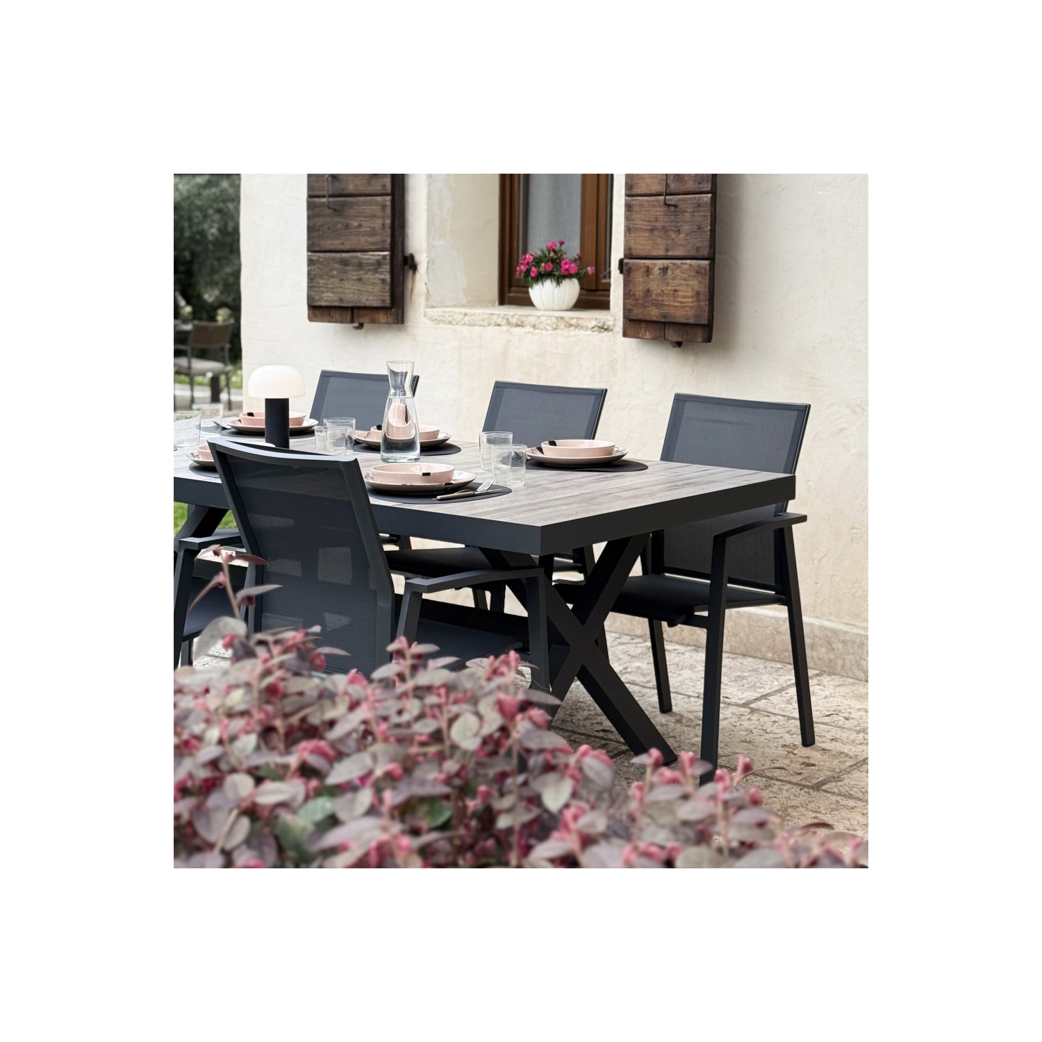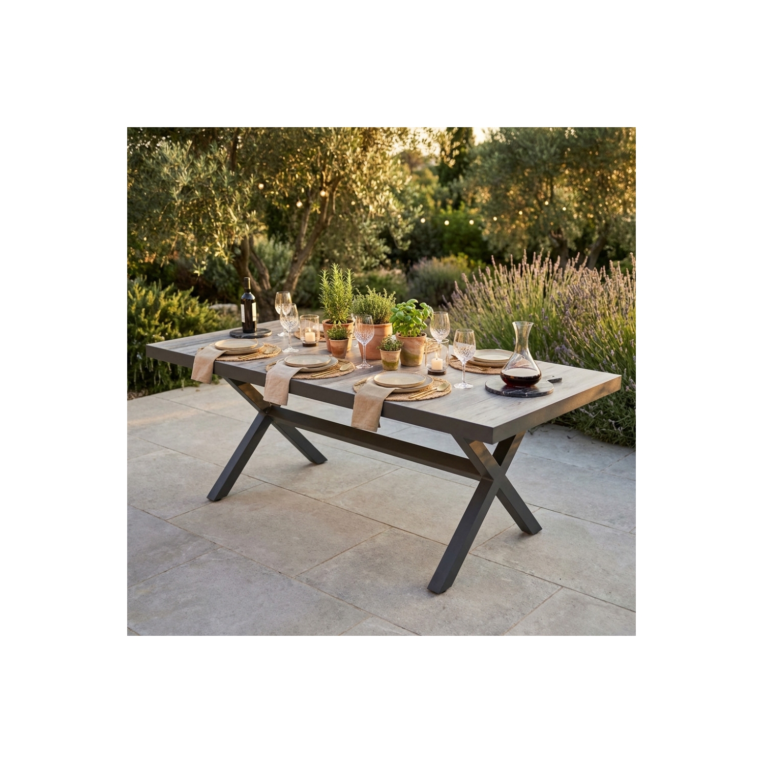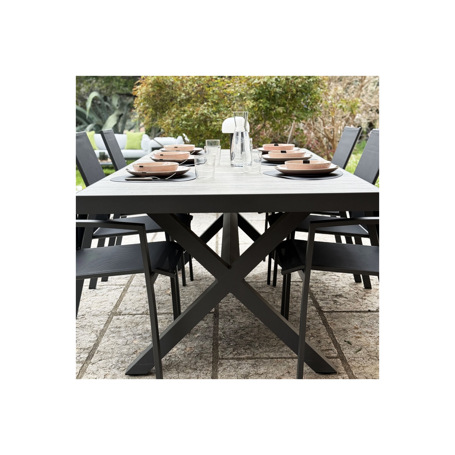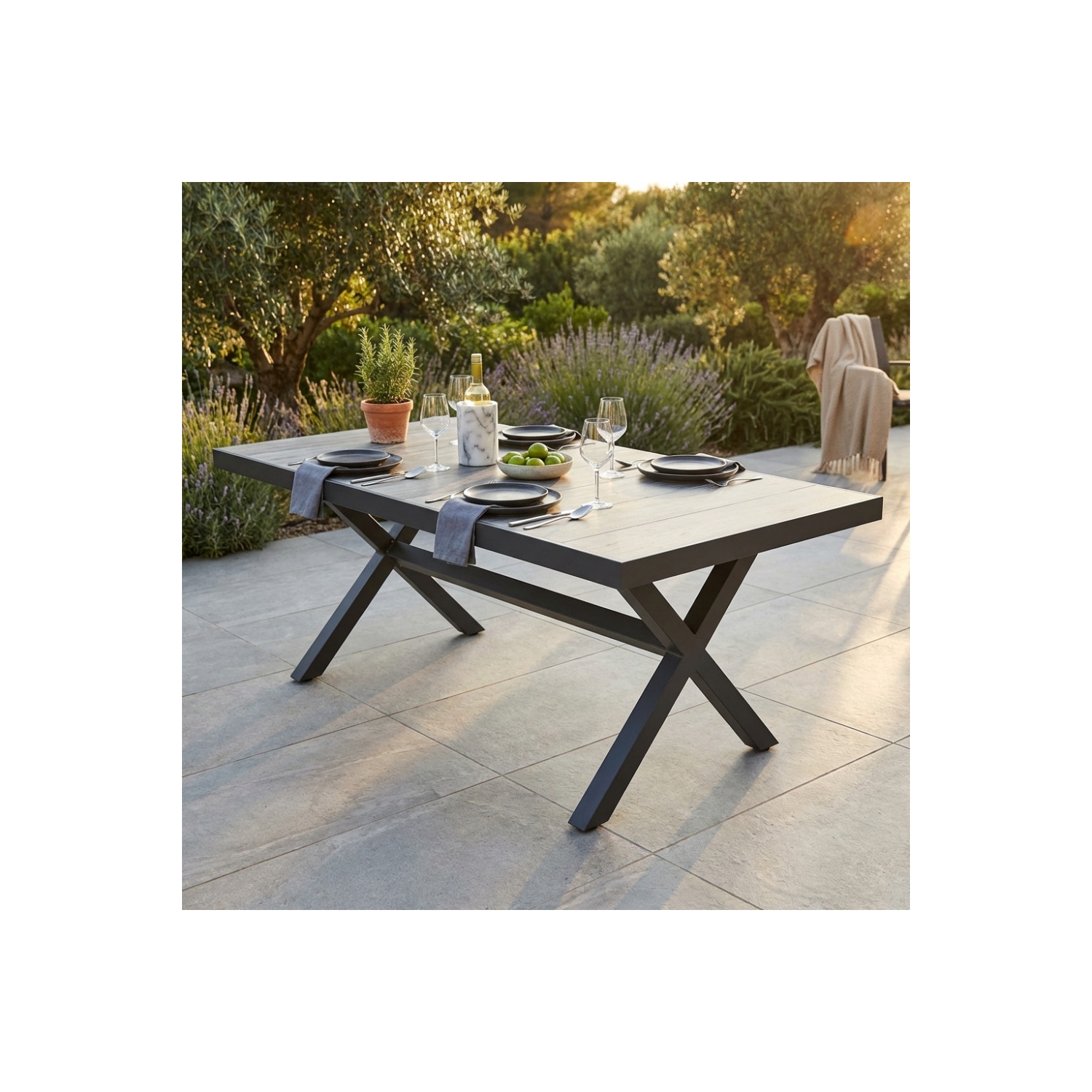 Struttura in allumino ANTRACITE. Piano del tavolo in ceramica effetto legno. Dimensioni: cm 200x100x75 h