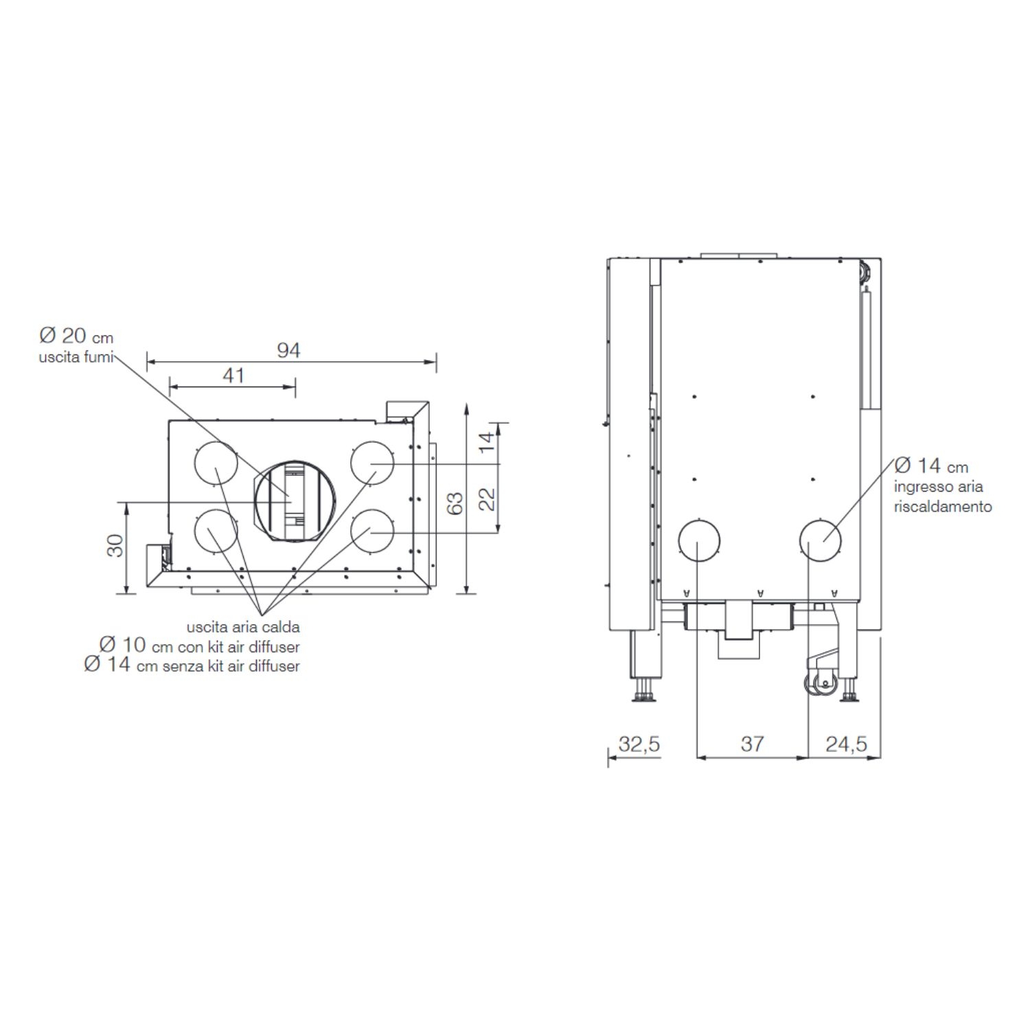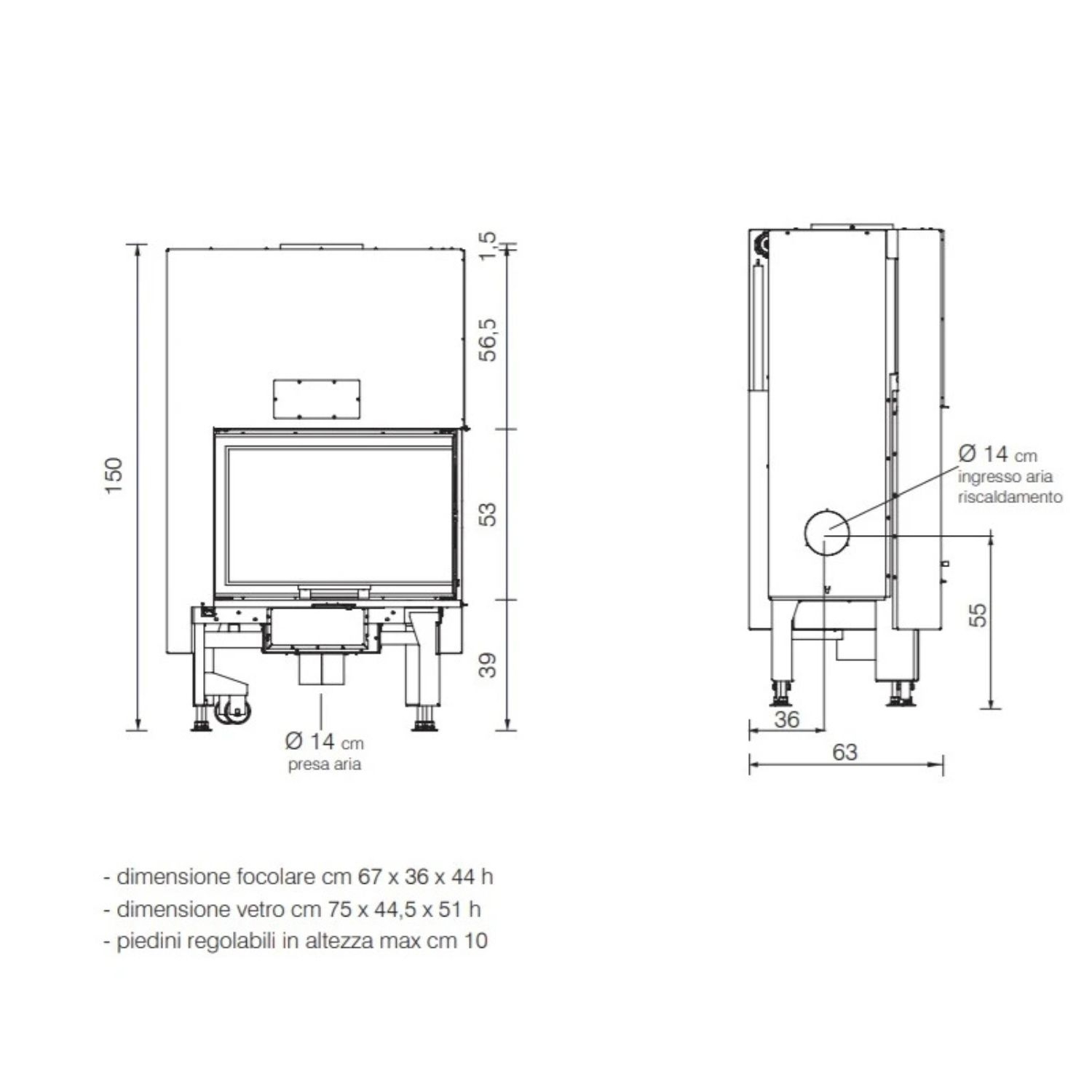 Caminetto focolare a legna Edilkamin Windo2 75 versione sinistra (installazione in angolo sinistro con vetro a destra), art.803030 in acciaio nero.