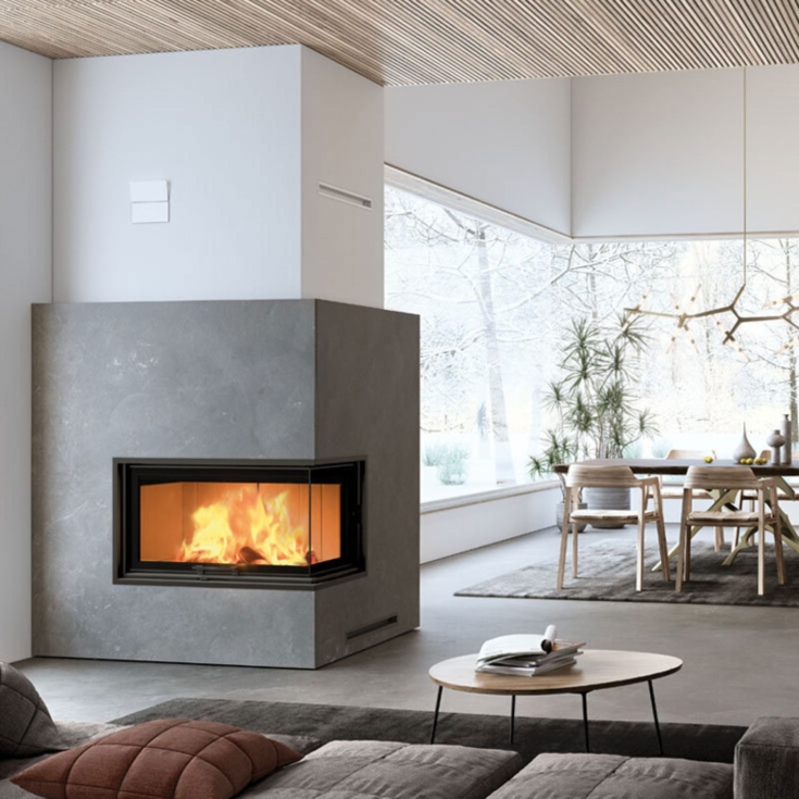 Focolare a legna con vetro angolare destro con installazione angolo sinistro.