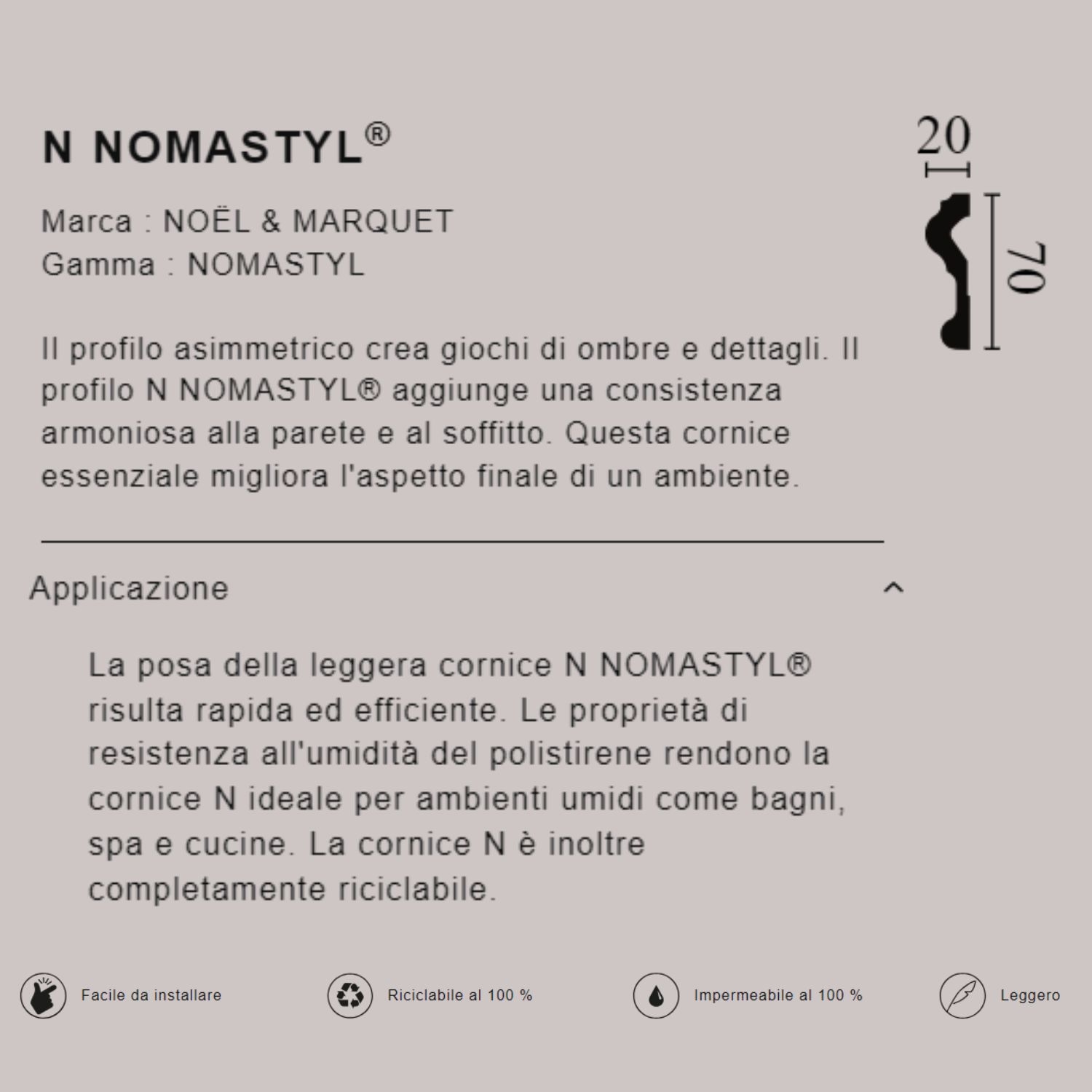 Questa semplice curvatura è un’aggiunta intramontabile per gli interni e fornisce una finitura netta e professionale. La cornice per soffitto N NOMASTYL® è sottile e risalta il naturale passaggio dalla parete al soffitto. Grazie al polistirene resistente all’umidità, la modanatura N NOMASTYL® è ideale per gli spazi umidi.