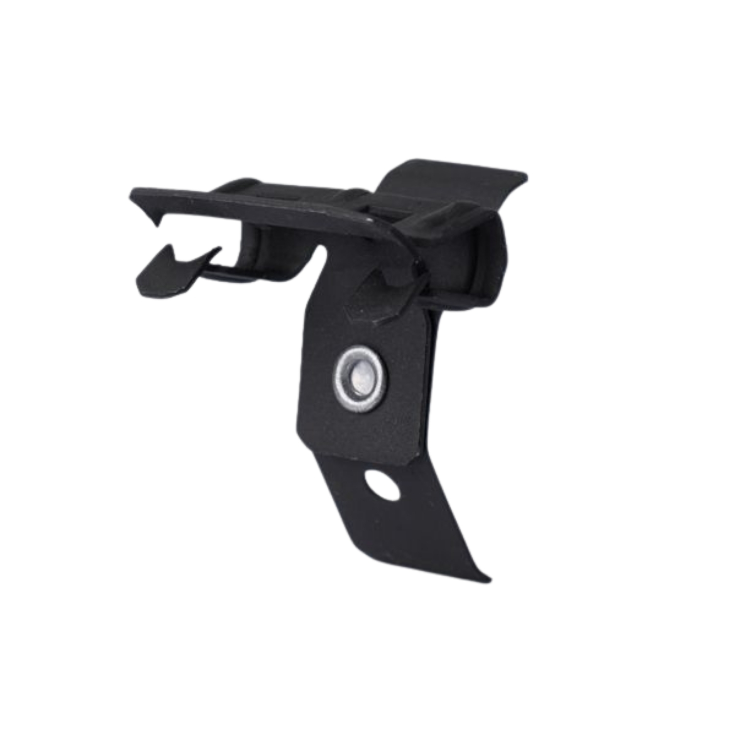 Clip di supporto con molla per pendino in acciaio armonico HRC 45/50 con finitura anticorrosiva fosfata nera. Spessore: 1.1mm Spessore di utilizzo: 4-10mm