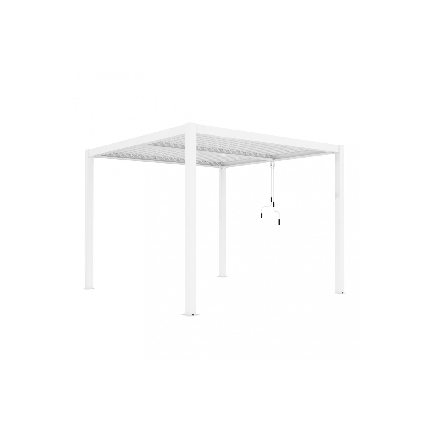 Pergola bioclimatica 3x4 mt in alluminio bianco copertura a lamelle frangisole orientabili a movimentazione manuale. Dimensioni: cm 300 l x 400 p x 250 h
