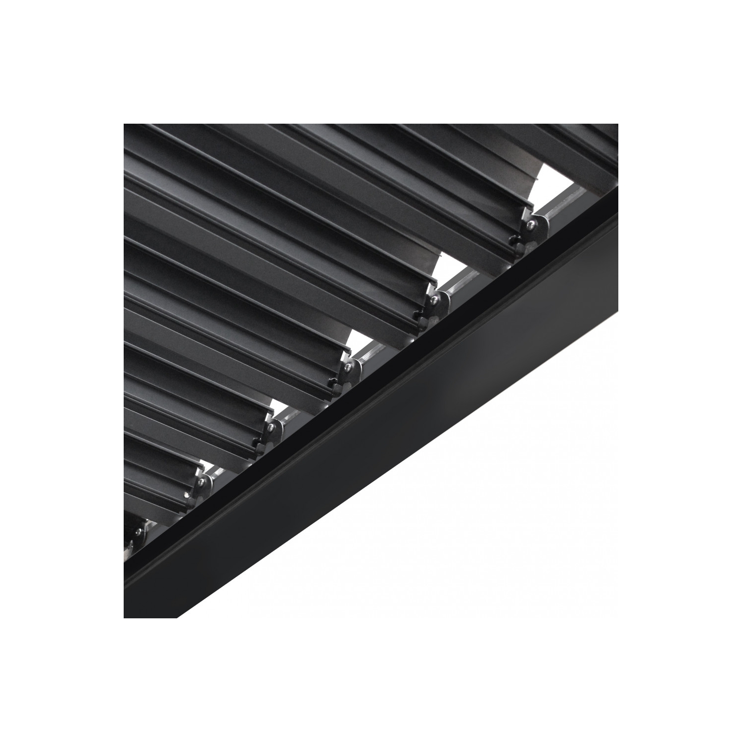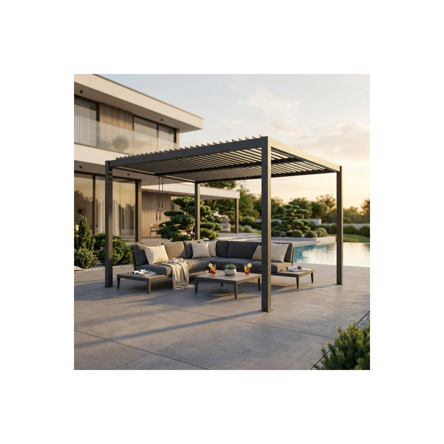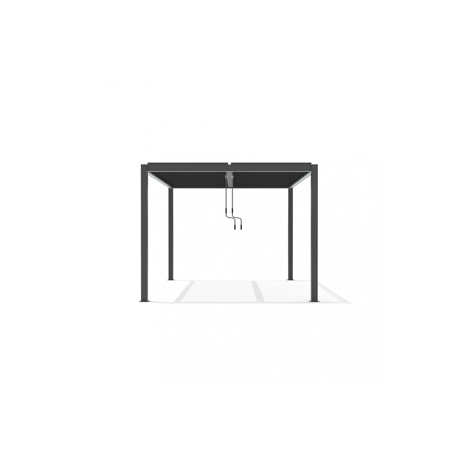 Pergola bioclimatica 3x4 mt in alluminio grigio scuro copertura a lamelle frangisole orientabili a movimentazione manuale. Dimensioni: cm 300 l x 400 p x 250 h