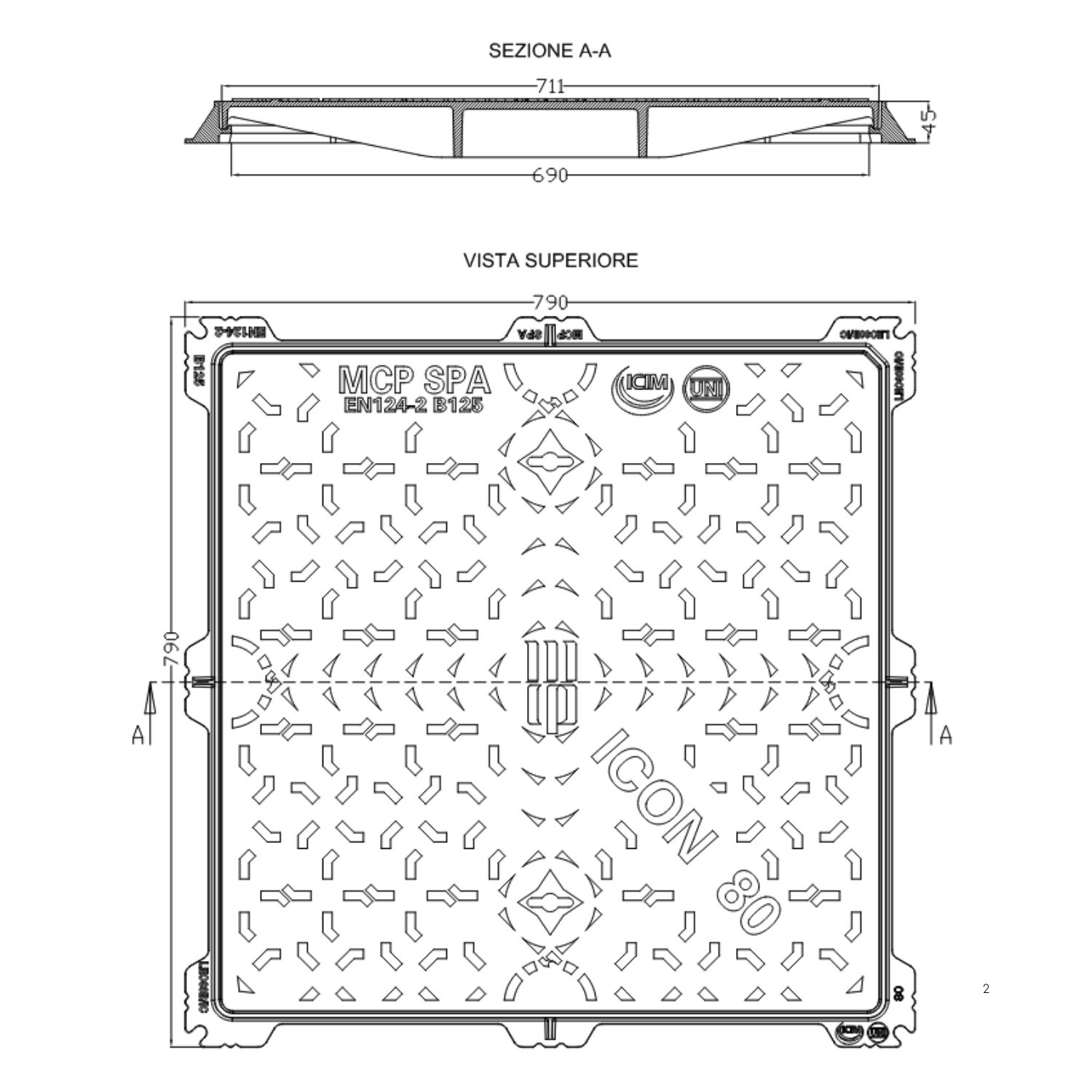 - adeguata aletta perimetrale esterna, continua sui quattro lati, opportunamente sagomata e smussata agli angoli per ottenere una maggiore base di appoggio e consentire un migliore