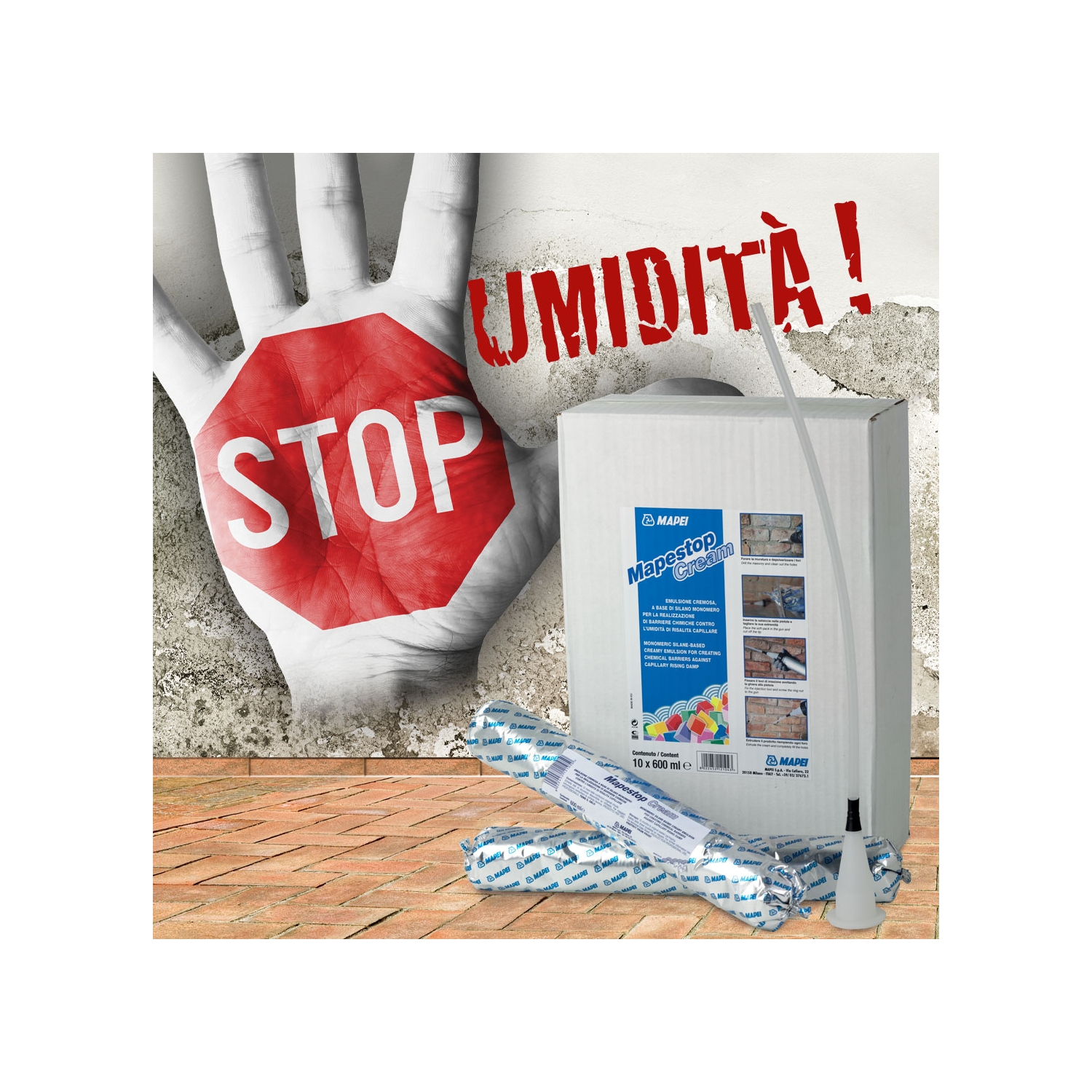 Mapestop Cream Mapei è un'emulsione cremosa a base di silano monomero per la realizzazione di barriere chimiche contro l’umidità di risalita capillare. Cartuccia da 600 ml