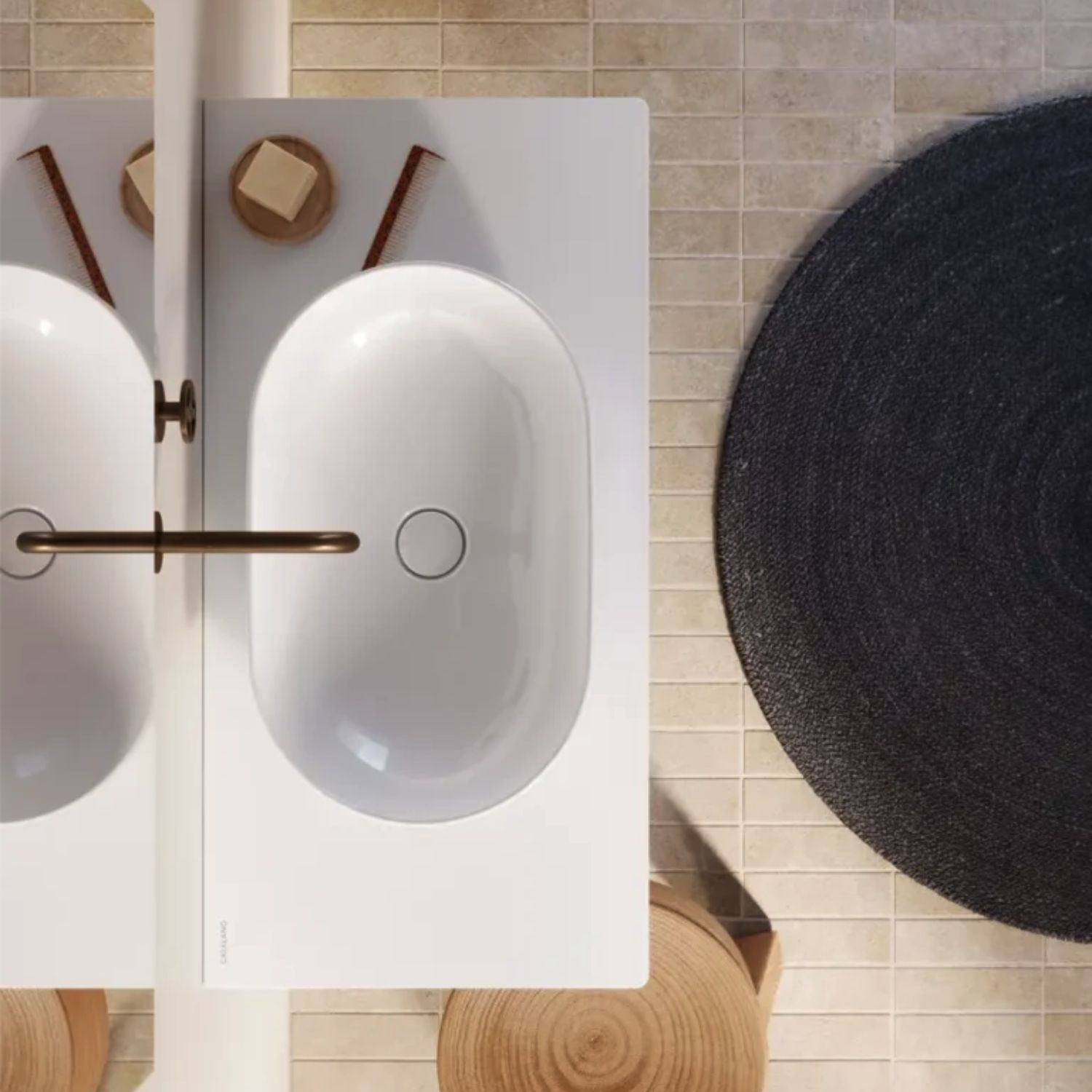 Lavabo ellittico in ceramica senza troppopieno. Installazione ad appoggio. Smalto antibatterico Cataglaze+.