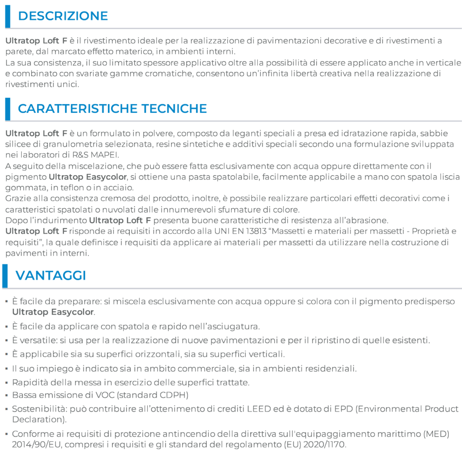 Ultratop Loft è un sistema a base cementizia per la realizzazione di pavimenti e rivestimenti decorativi con effetto spatolato o nuvolato, caratterizzati da un marcato aspetto materico da elevate resistenze all'albrazione e da limitato spessore. Ultratop loft F è una pasta cementizia spatolabile a grana grossa. Normalmente viene utulizzato in abbinamento nella realizzazione dei rivestimenti, secondo le specifiche di progetto.