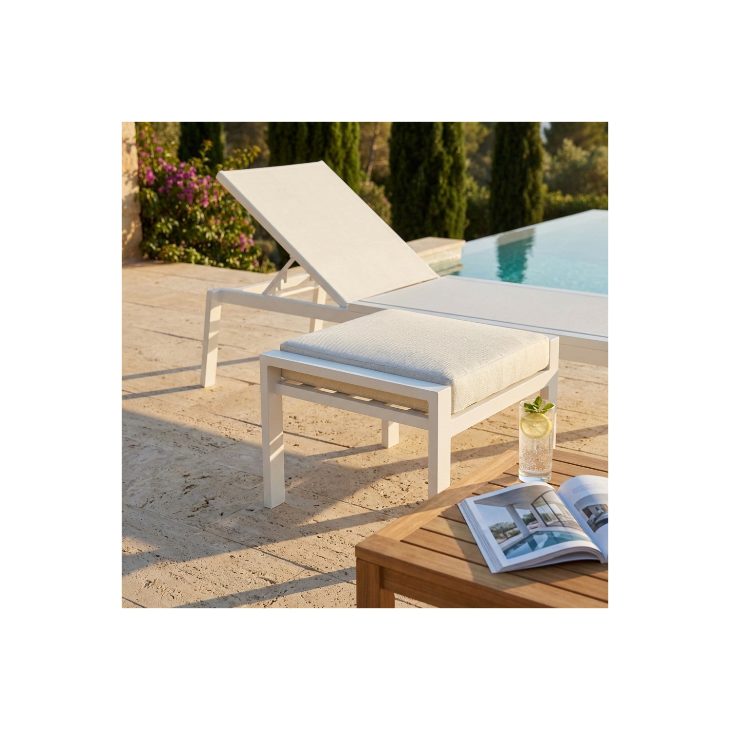 Poggiapiedi in alluminio verniciato BIANCO con cuscino. Dimensioni: 65x56x41h cm. Poltrona venduta separatamente.