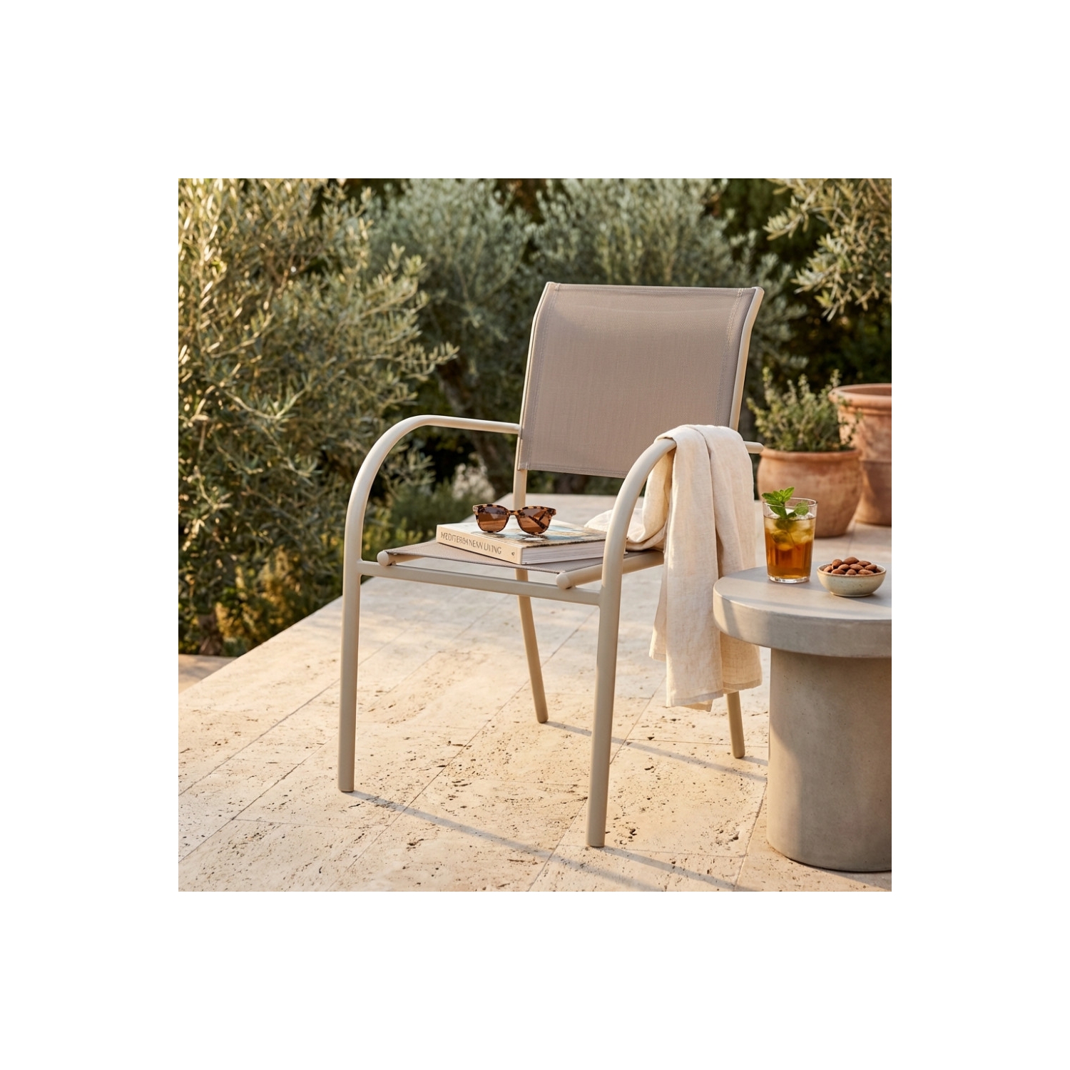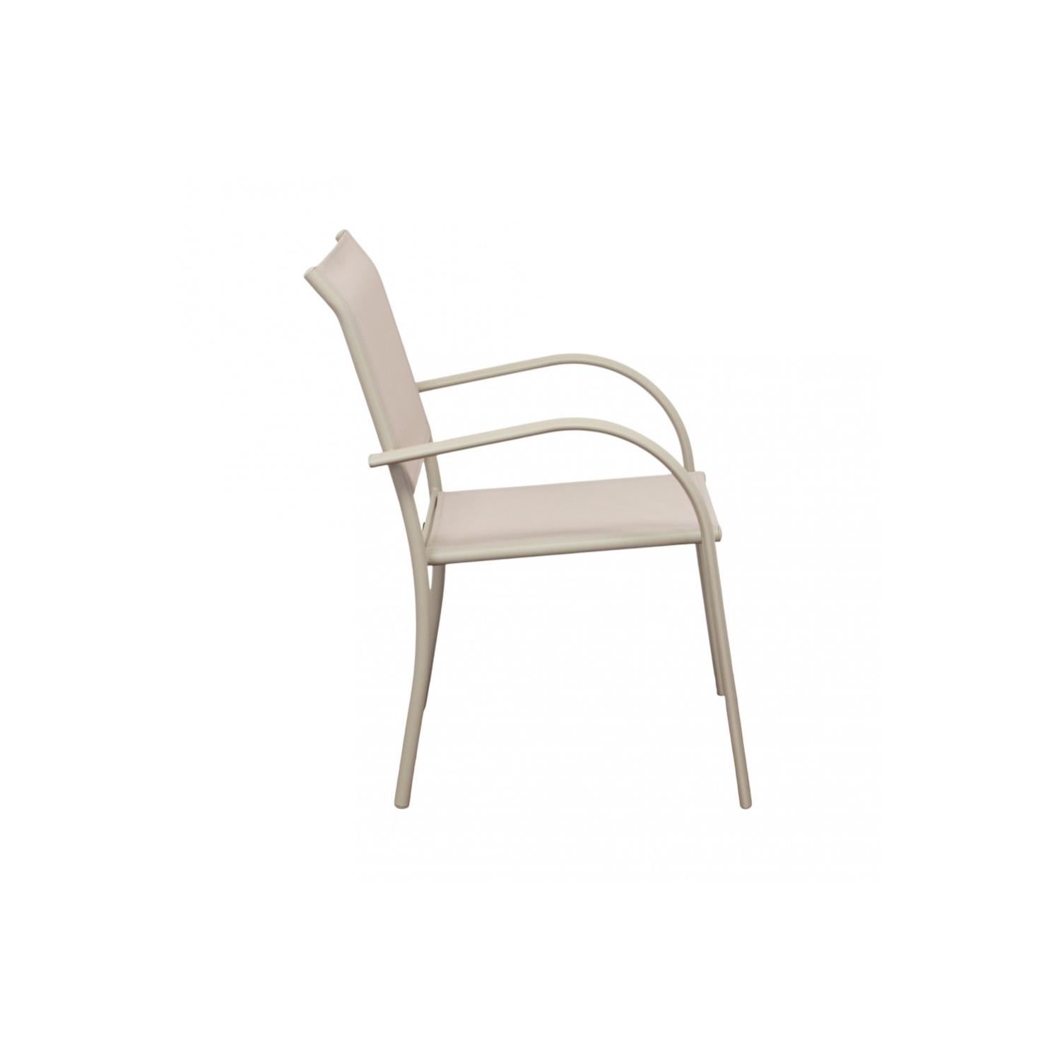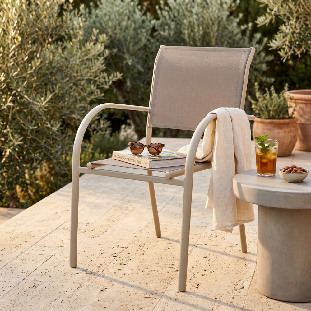 Poltrona da giardino in allumino tortora e tessuto con braccioli - STAMFORD. Impilabile: SI. Dimensioni: 56x63x86cm