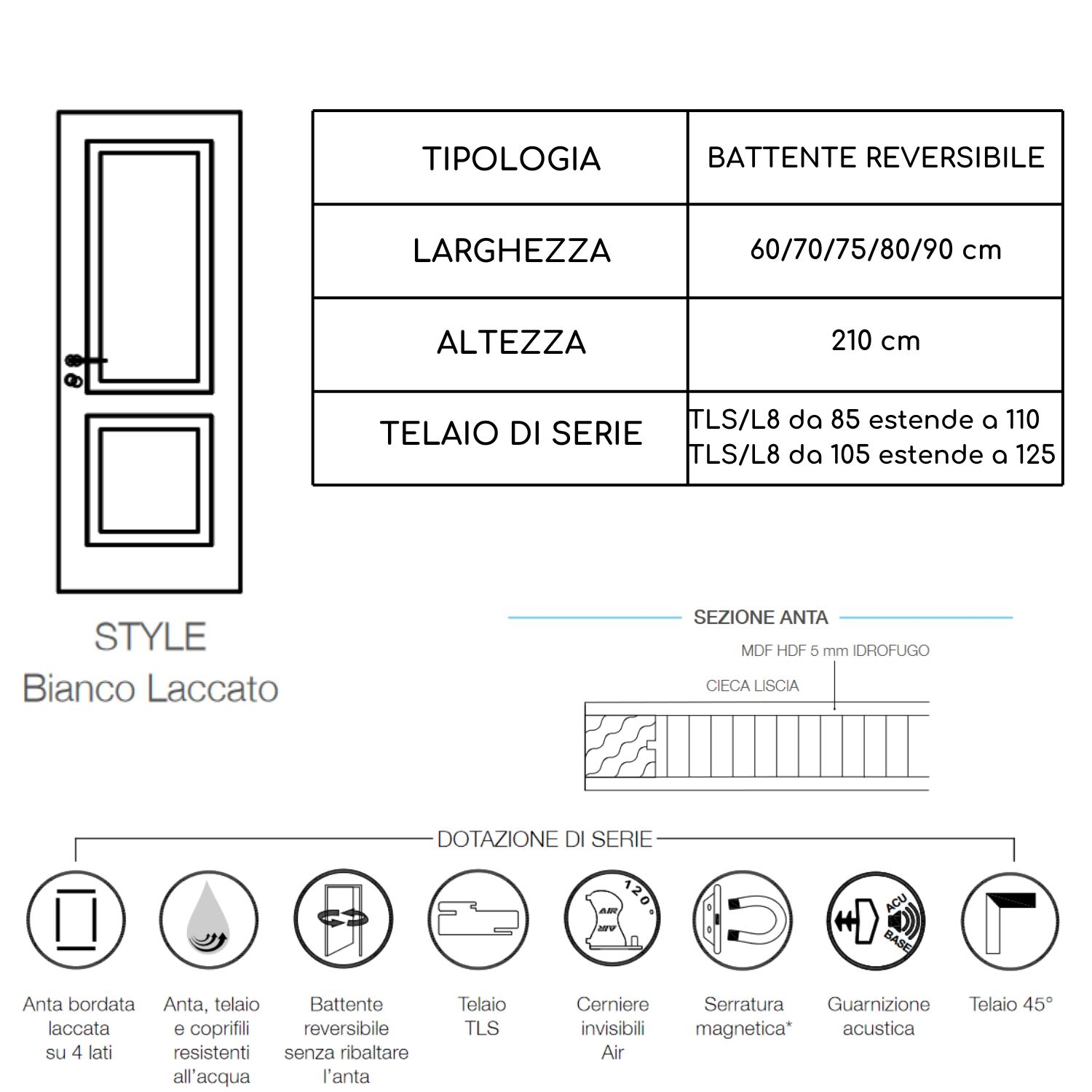 Porta battente reversibile bianca laccata per interni Made in Italy linea STYLE. Anta bordata laccata su 4 lati. Anta, telaio e coprifili resistenti all'acqua. Anta in MDF HDF 5mm Idrofugo. Portalacasa by Bertolotto