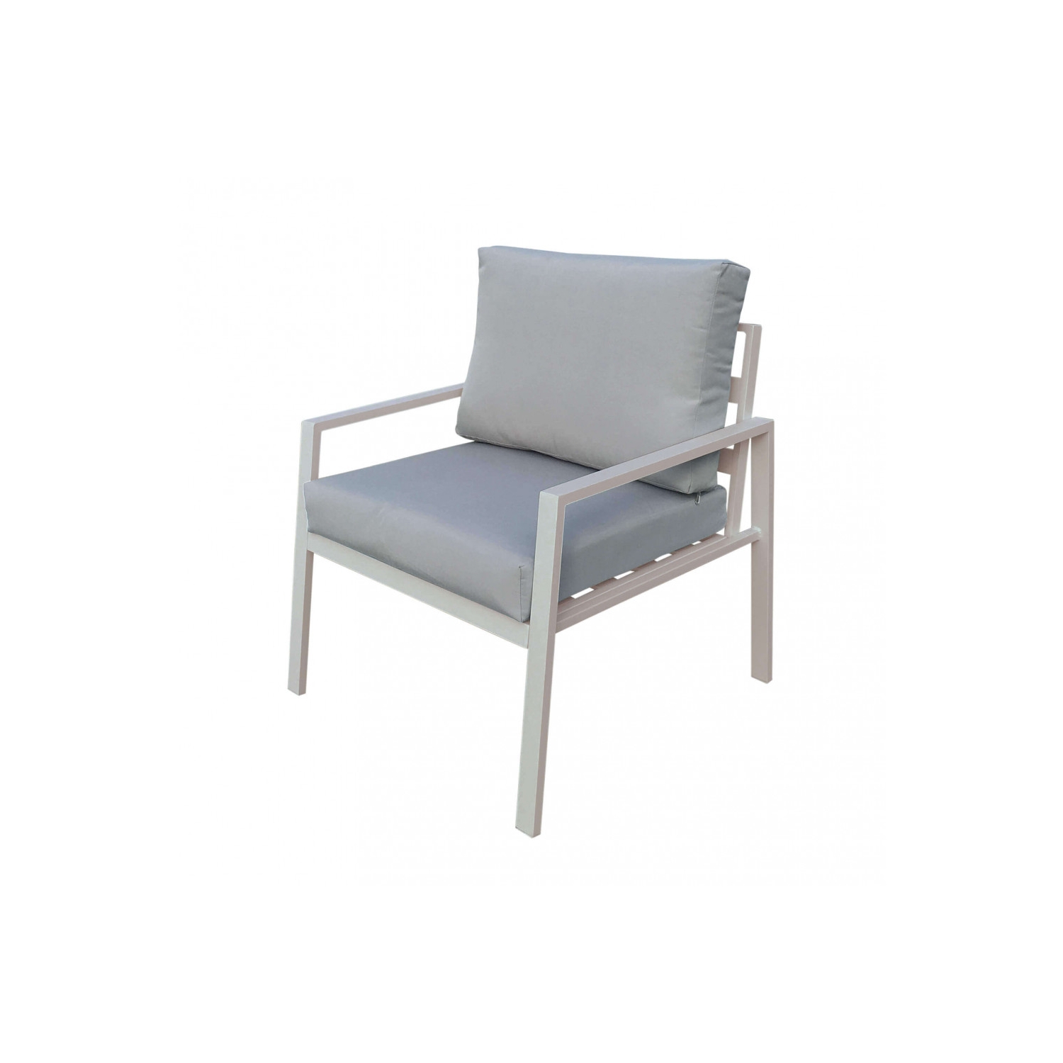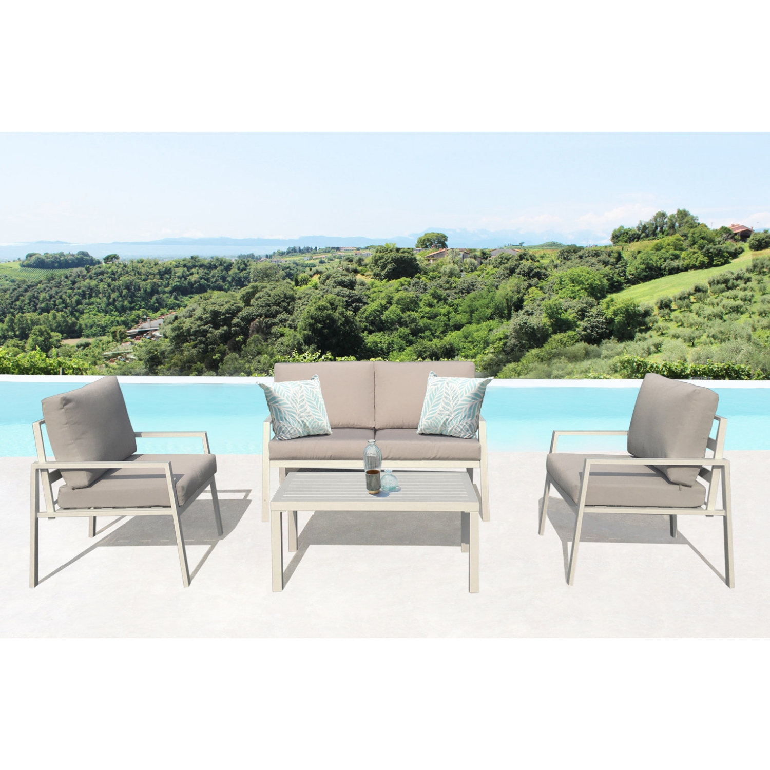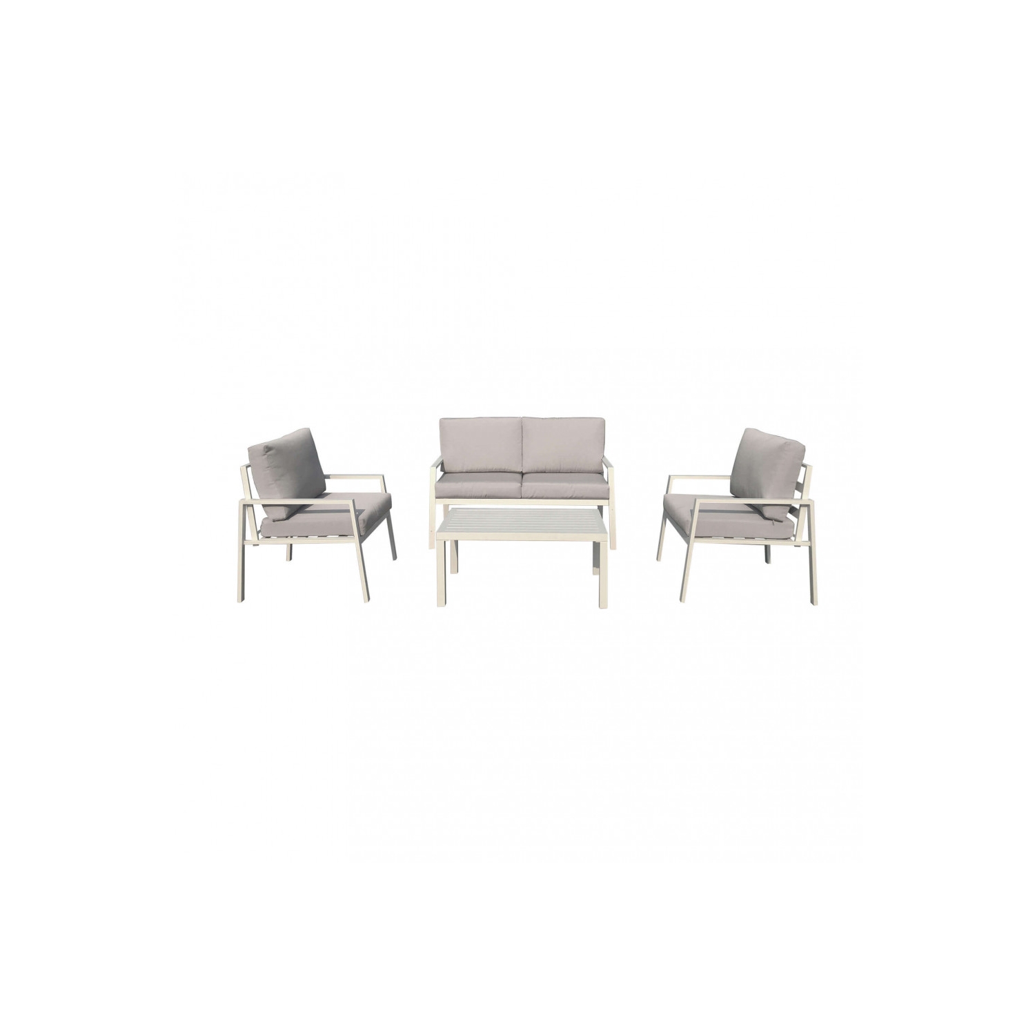 Articoli inclusi: divanetto, 2 poltroncine, tavolino, cuscini. Struttura in alluminio TORTORA. Cuscini in poliestere 10 cm. Divanetto: 128x77x79cm Poltroncine: 68x77x79cm Tavolino: 51,5x95x46cm
