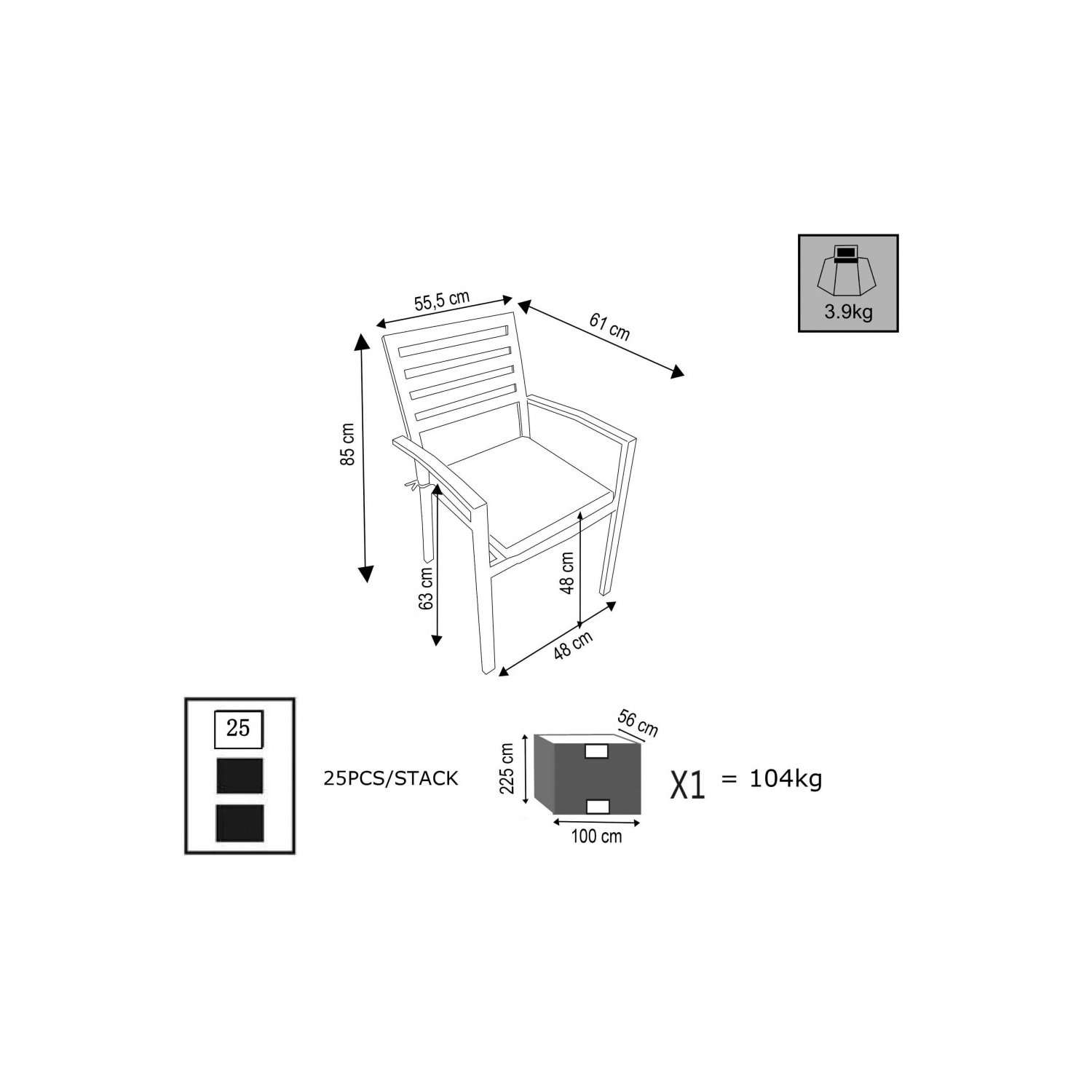 Struttura e seduta in alluminio TAUPE con cuscino TAUPE. Dimensioni: cm 46 x 62 x 84 h