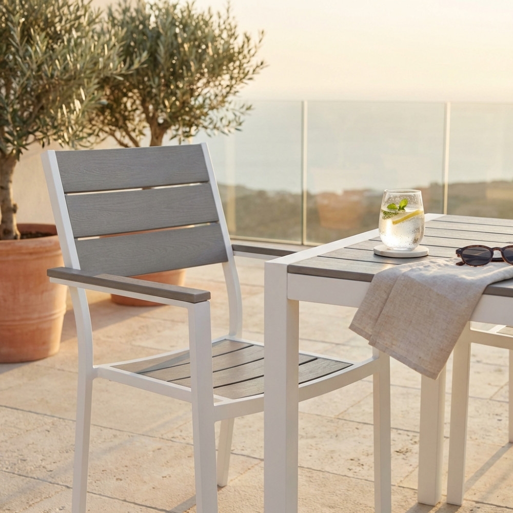 Sedia da giardino con struttura in alluminio verniciato, schienale e seduta con doghe in POLYWOOD colore grigio. Dimensioni: 58x58x89 h cm. Colore: Bianca