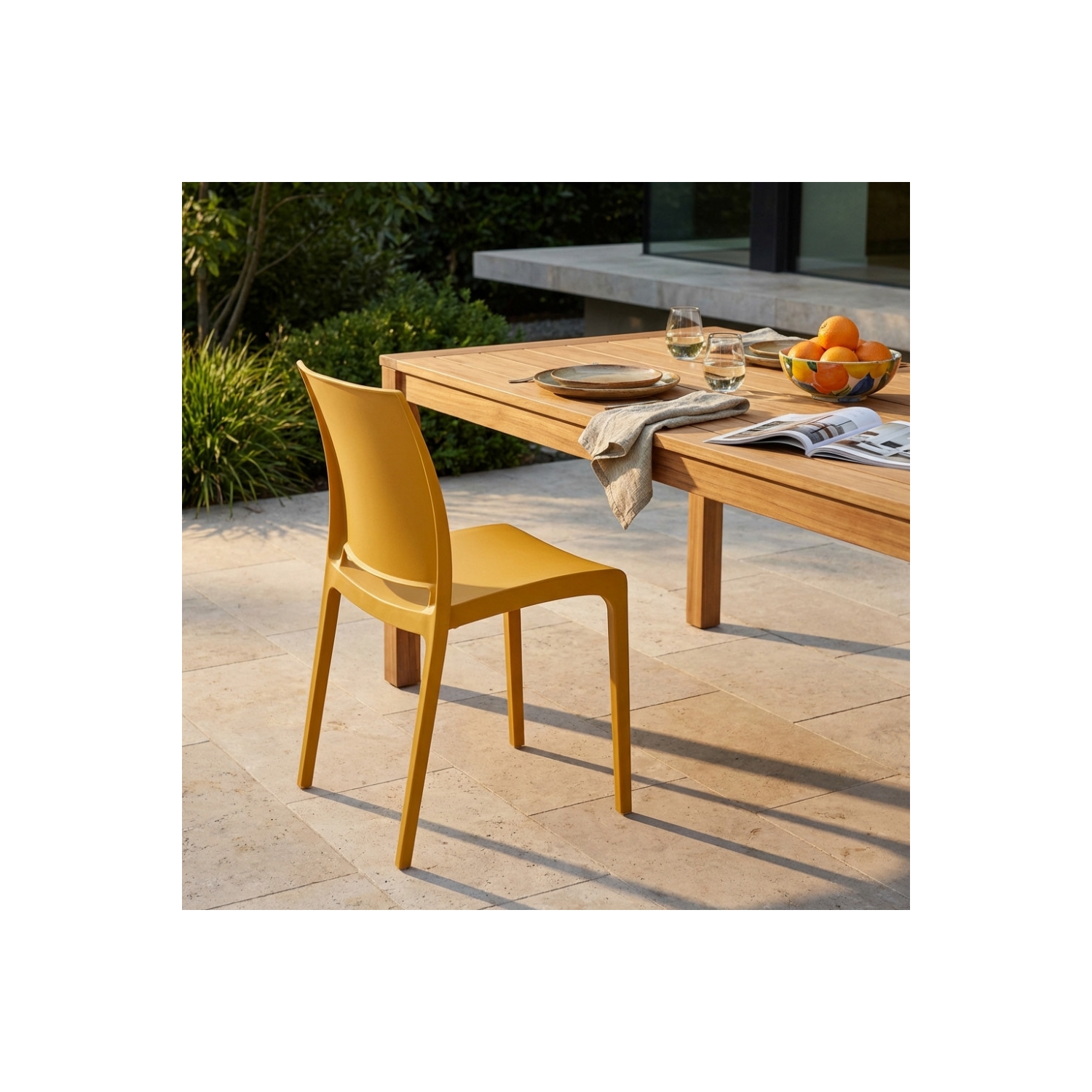 Sedia impilabile in polipropilene e fibra di vetro con tappi antiscivolo. Dimensioni: cm 46 x 54 x 80 h. Colore: Giallo
