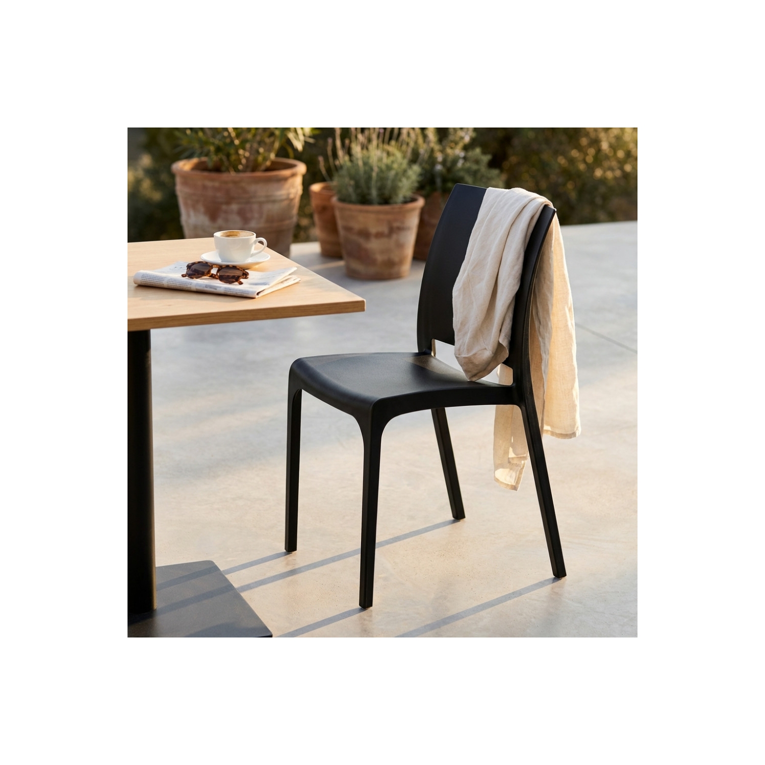 Sedia impilabile in polipropilene e fibra di vetro con tappi antiscivolo. Dimensioni: cm 46 x 54 x 80 h. Colore: Nera