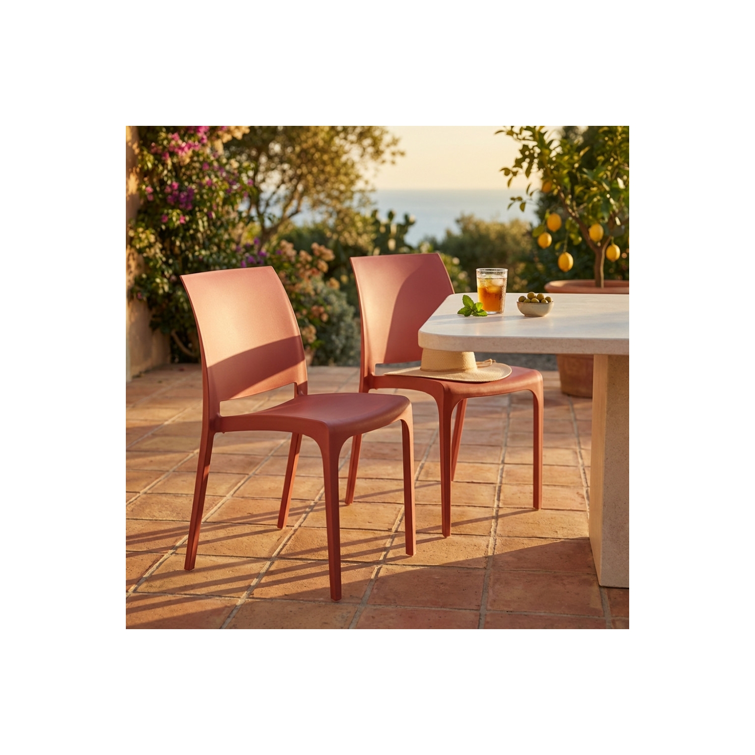Sedia impilabile in polipropilene e fibra di vetro con tappi antiscivolo. Dimensioni: cm 46 x 54 x 80 h. Colore: Rossa