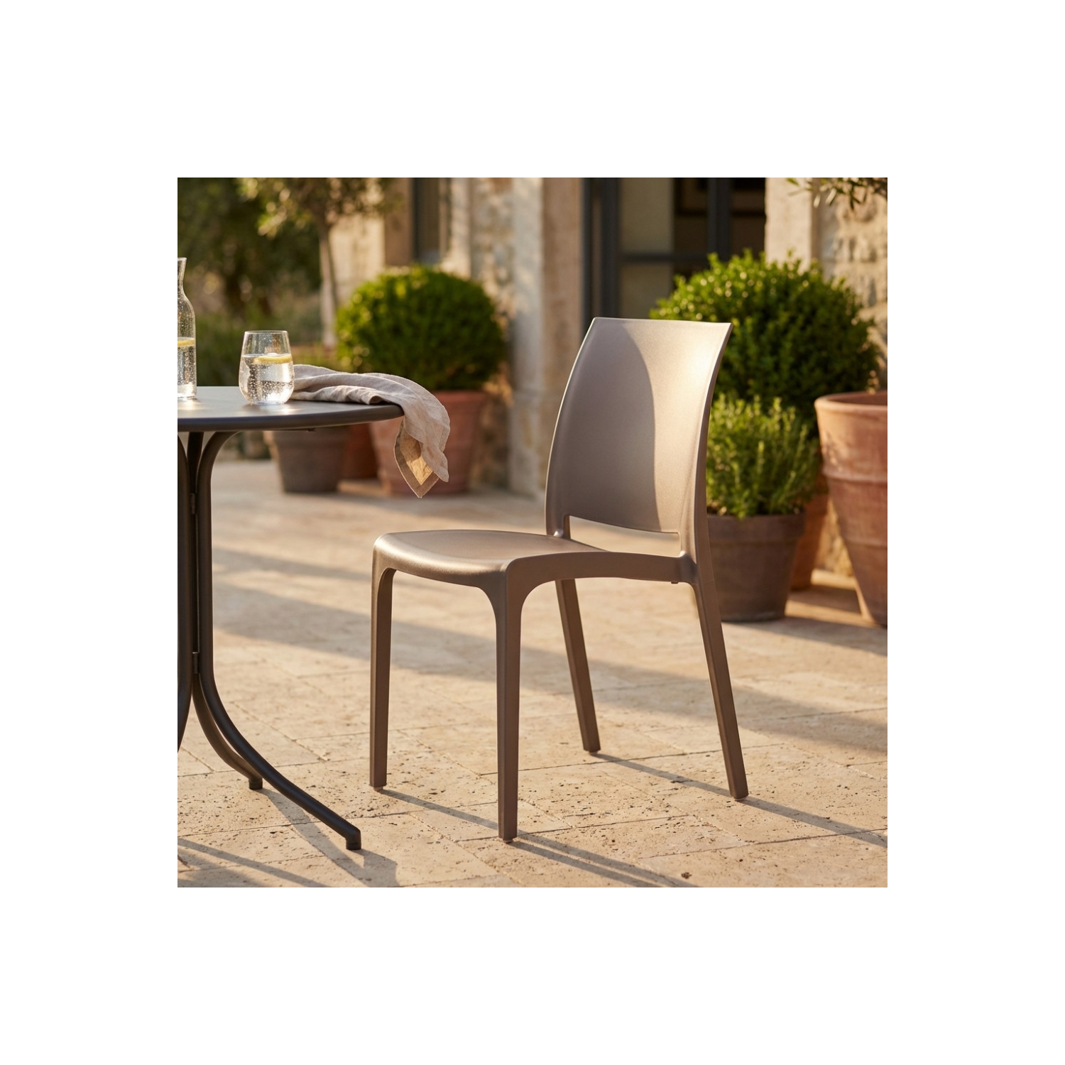 Sedia impilabile in polipropilene e fibra di vetro con tappi antiscivolo. Dimensioni: cm 46 x 54 x 80 h. Colore:Taupe
