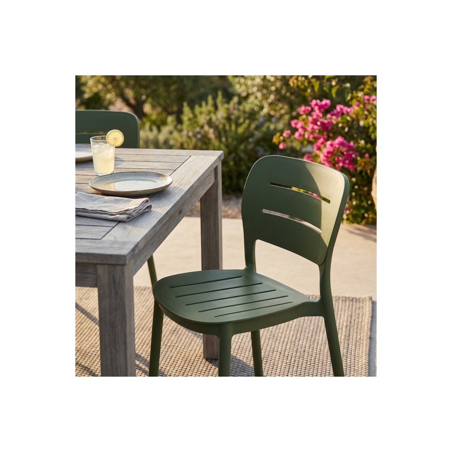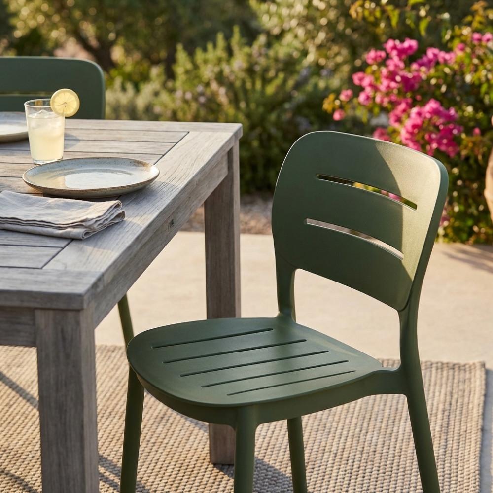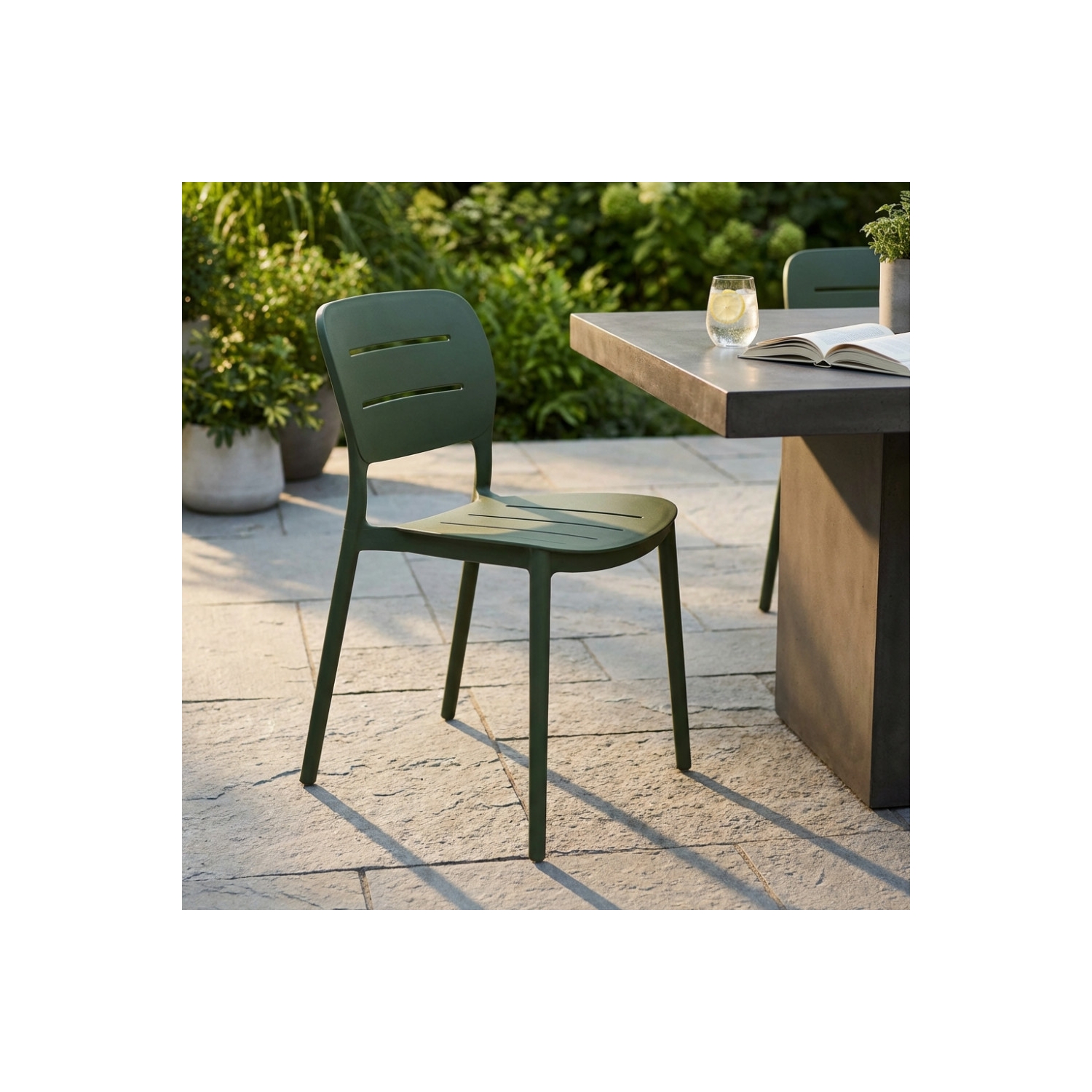 Sedia impilabile in polipropilene colorata. Dimensioni: cm 52,5 l x 44 p x 79 h