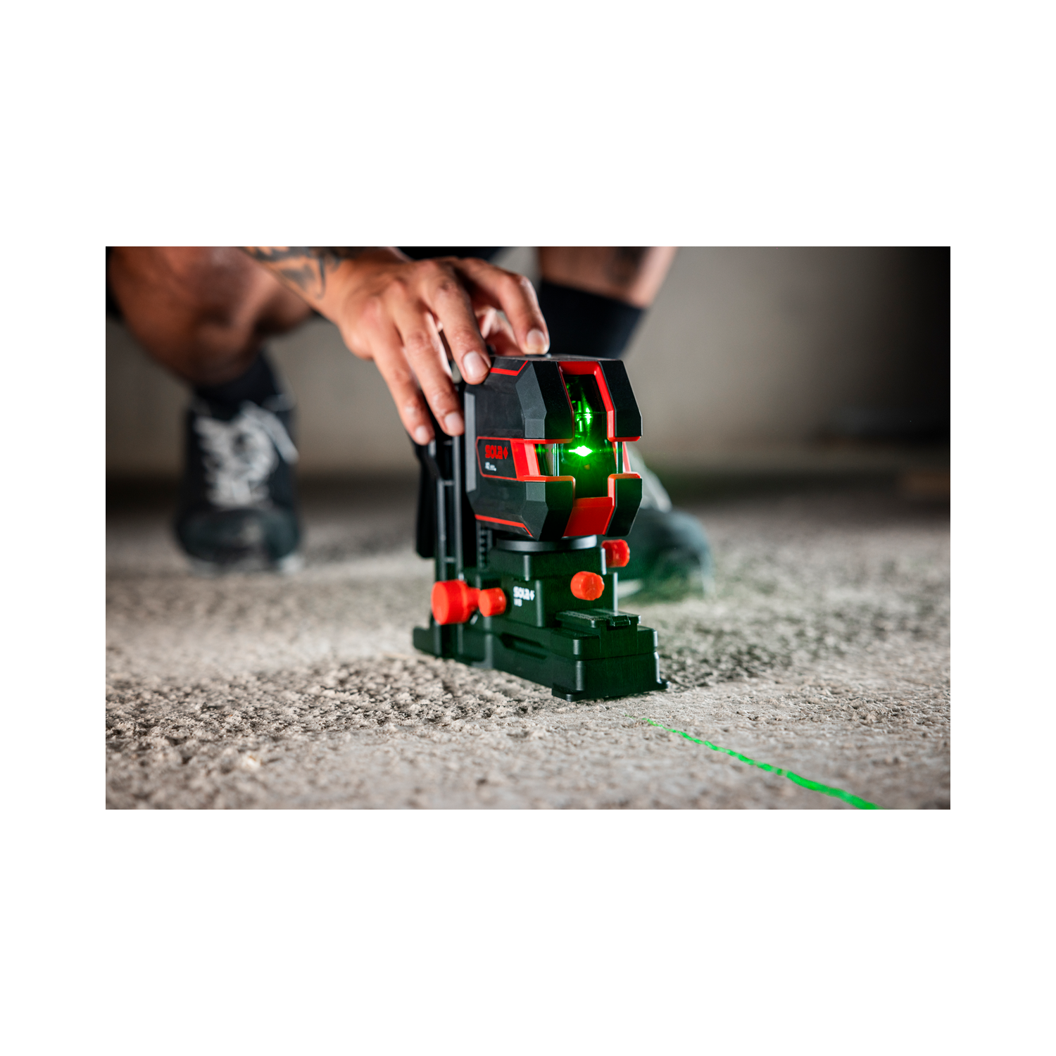 X2 GREEN è un laser a linee verde di facile utilizzo, ideale per ottenere un preciso allineamento orizzontale e verticale di oggetti. Offre una linea orizzontale e una linea verticale che possono essere attivate e disattivate singolarmente con la pressione di un pulsante. La finestra laser di grandi dimensioni permette linee laser particolarmente lunghe e visibili in un range di 170°, con una tolleranza di misurazione di ±0,2 mm/m, per un lavori esatti su pavimenti, soffitti e pareti.