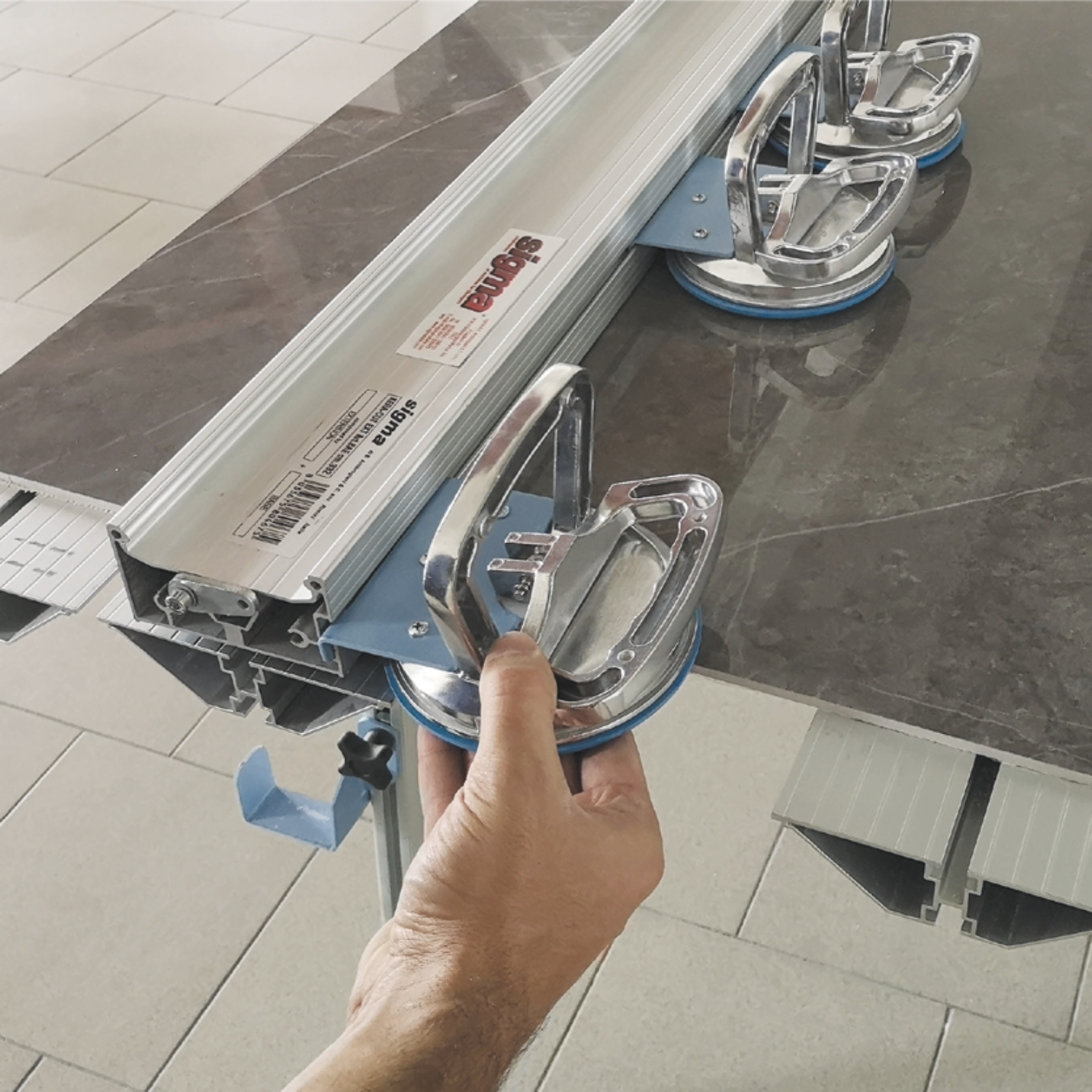 La tagliapiastrelle Sigma è progettato per il taglio di piastrelle di grande formato fino a 332 cm. Grazie alla guida in alluminio con ventose antimacchia, garantisce un fissaggio stabile sulla piastrella e un’incisione precisa tramite il carrello con rotella di taglio.