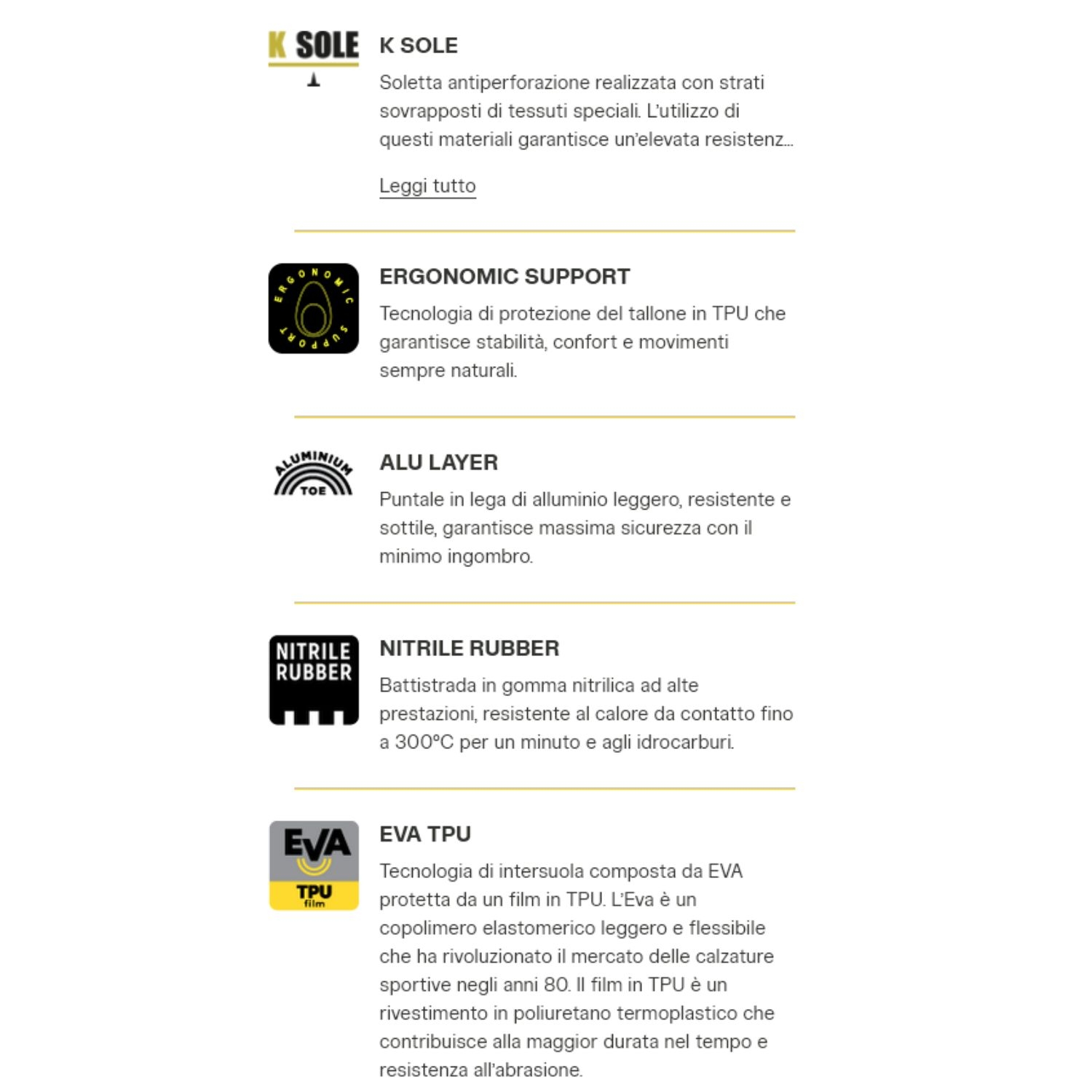 Caratteristiche principali: Supporto ergonomico del tallone in TPU. Puntale in alluminio 200J. Inserto antiperforazione K-SOLE. Calzata 10. Fodera Air Mesh. Plantare estraibile microforato in PU espanso a celle aperte, traspirante con carboni attivi.